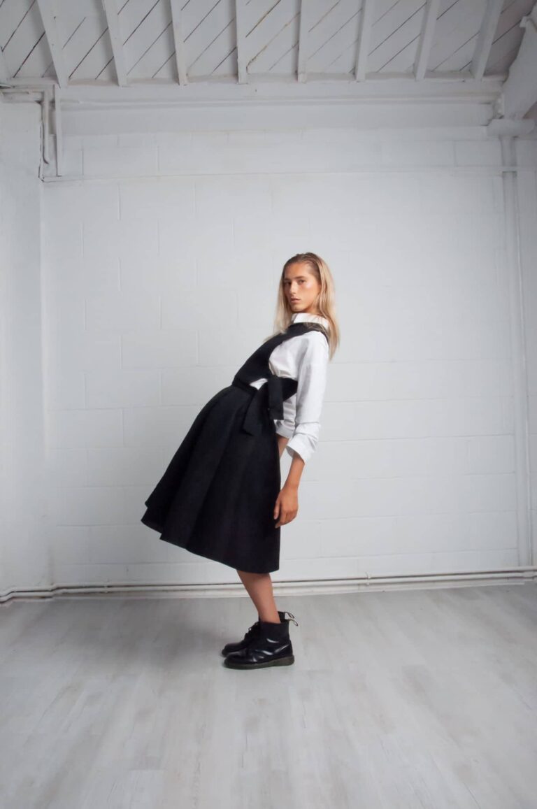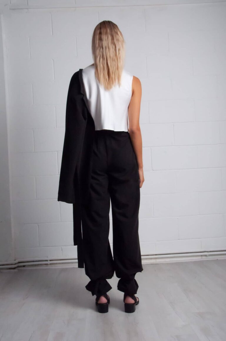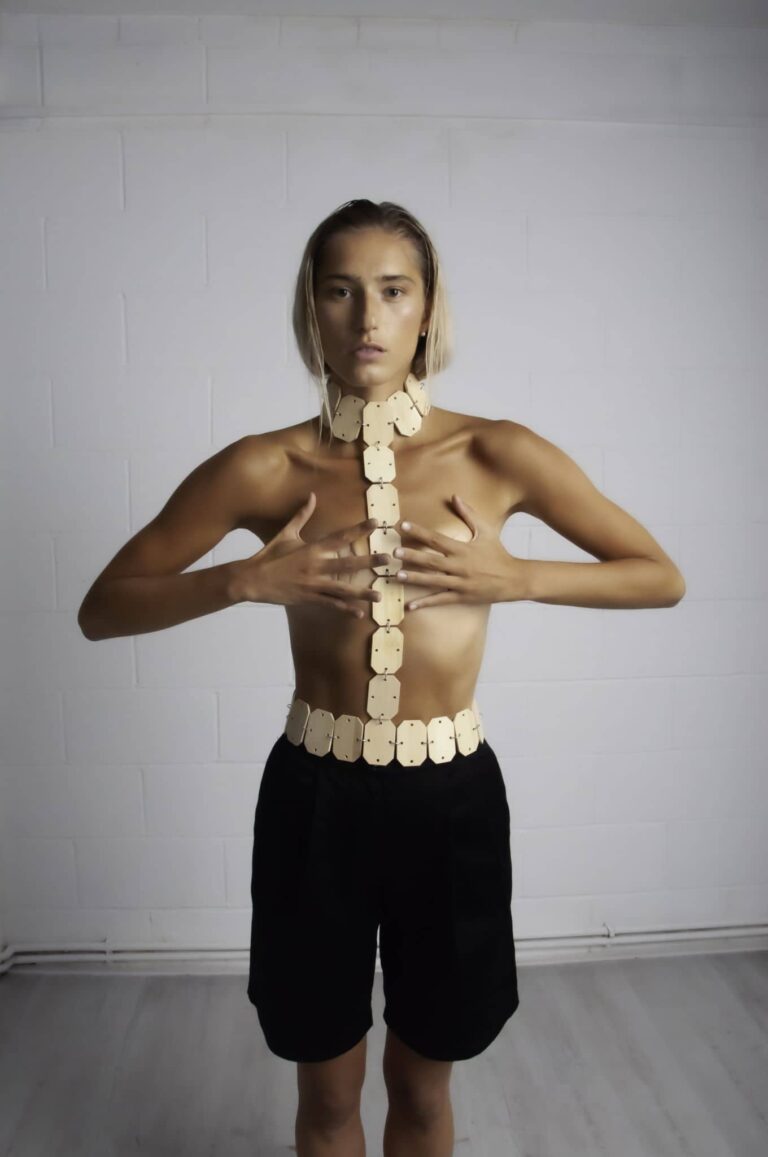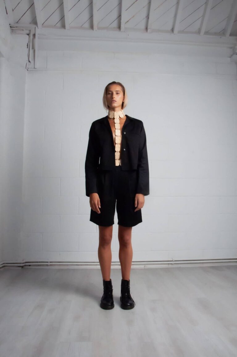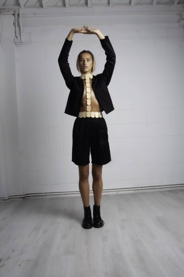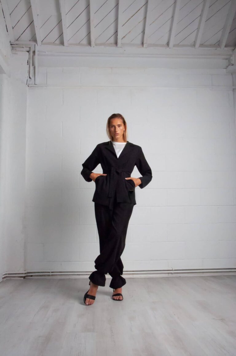 The collection is purely self-exploration in the time of quarantine. While everything stopped and the big city of London was quiet, creativity was awake. The collection is minimal with a kick of edginess. Bamboo as a fashion accessory is the trademark. With 23 pieces that make 16 looks, the emphasis is placed on the shoulders and waists, to include jackets and some blouses with shoulder pads, along with trousers – all high waisted.