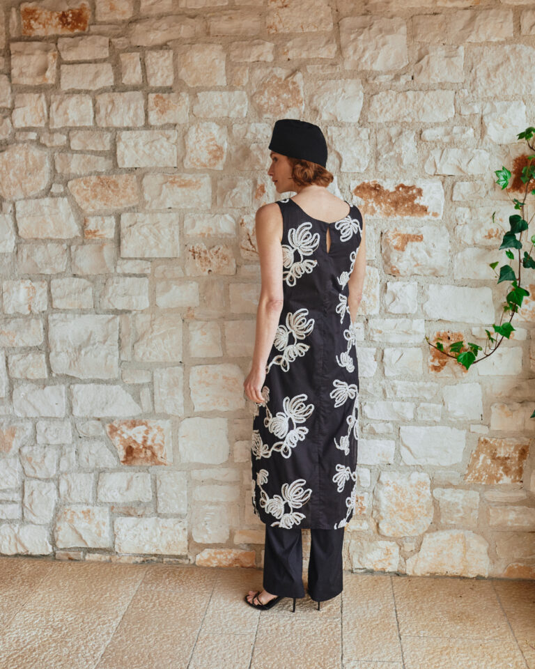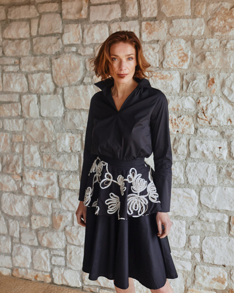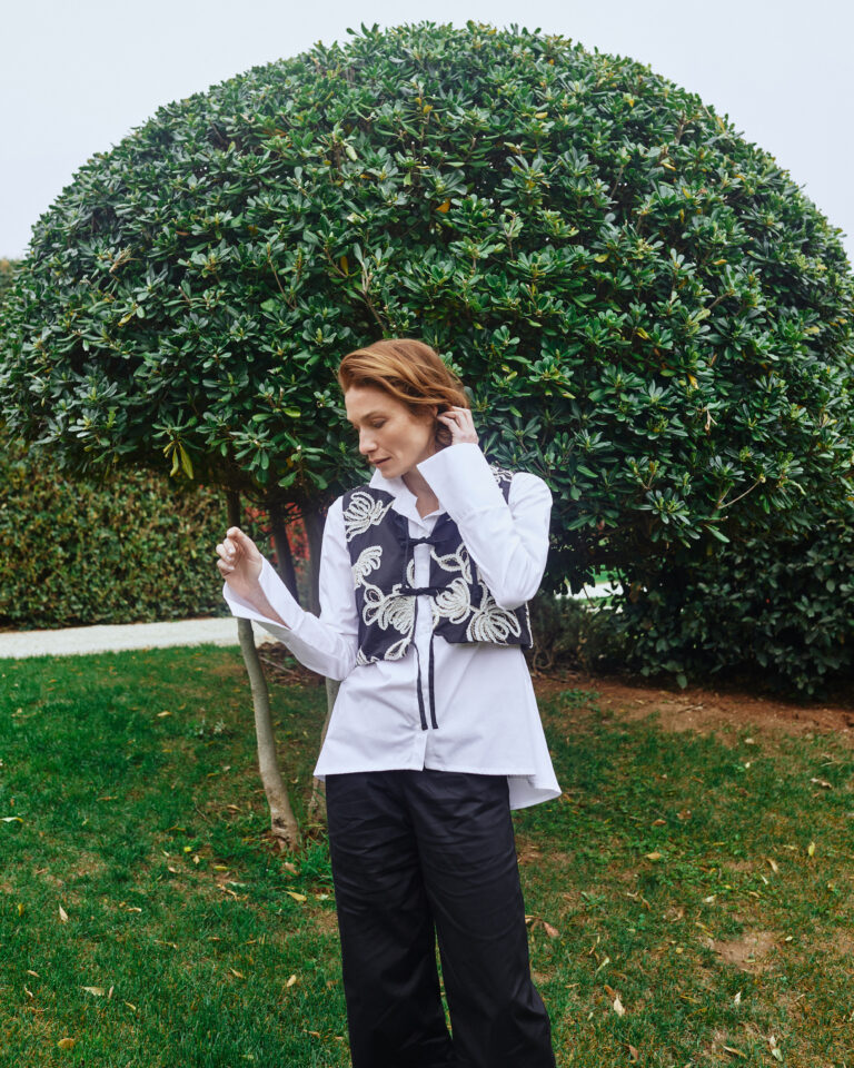 Embroidery emerges as a poetic detail, reinterpreted through stylized floral motifs. More than mere decoration, it becomes a subtle thread connecting heritage to the present, translated into a contemporary visual language.