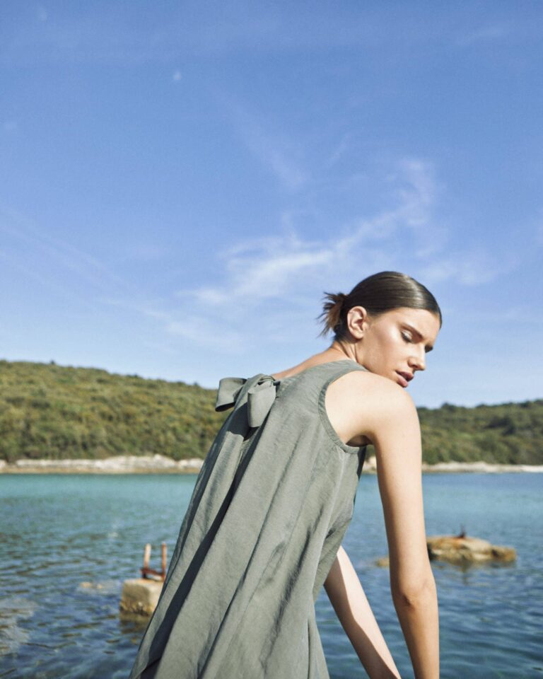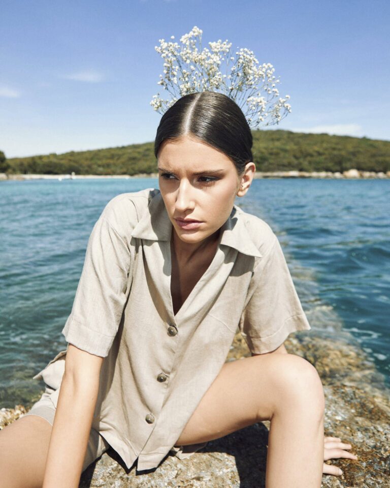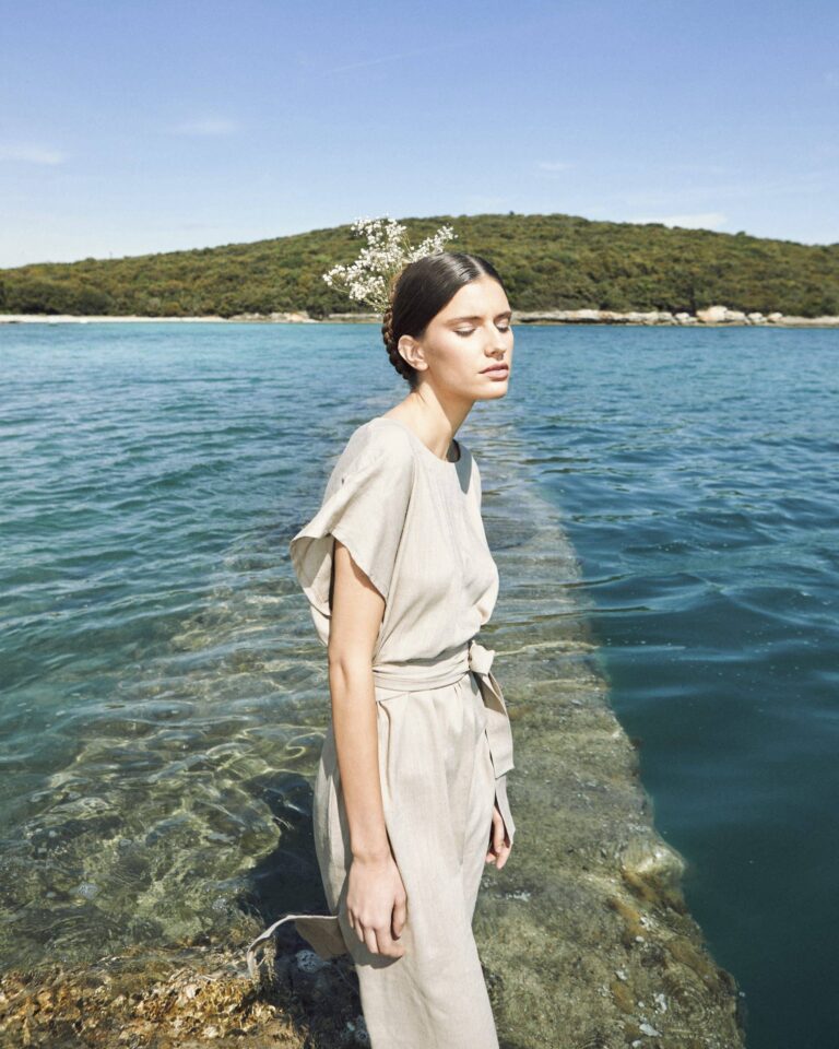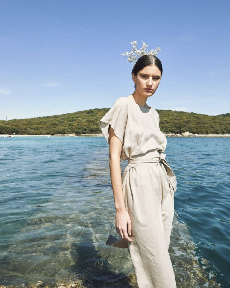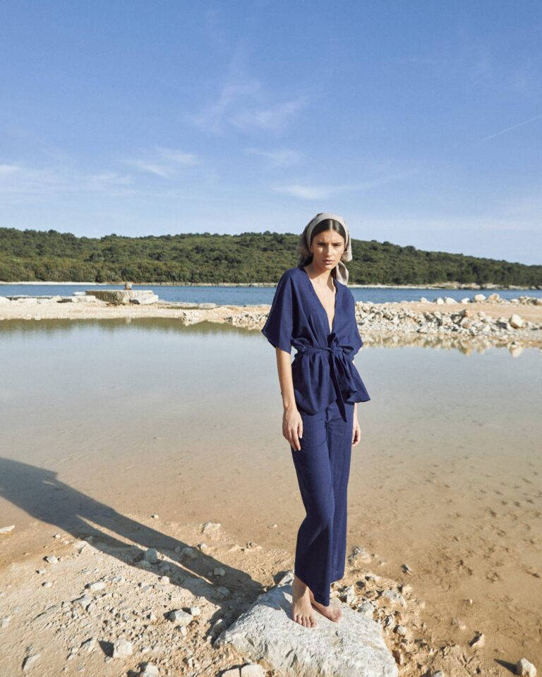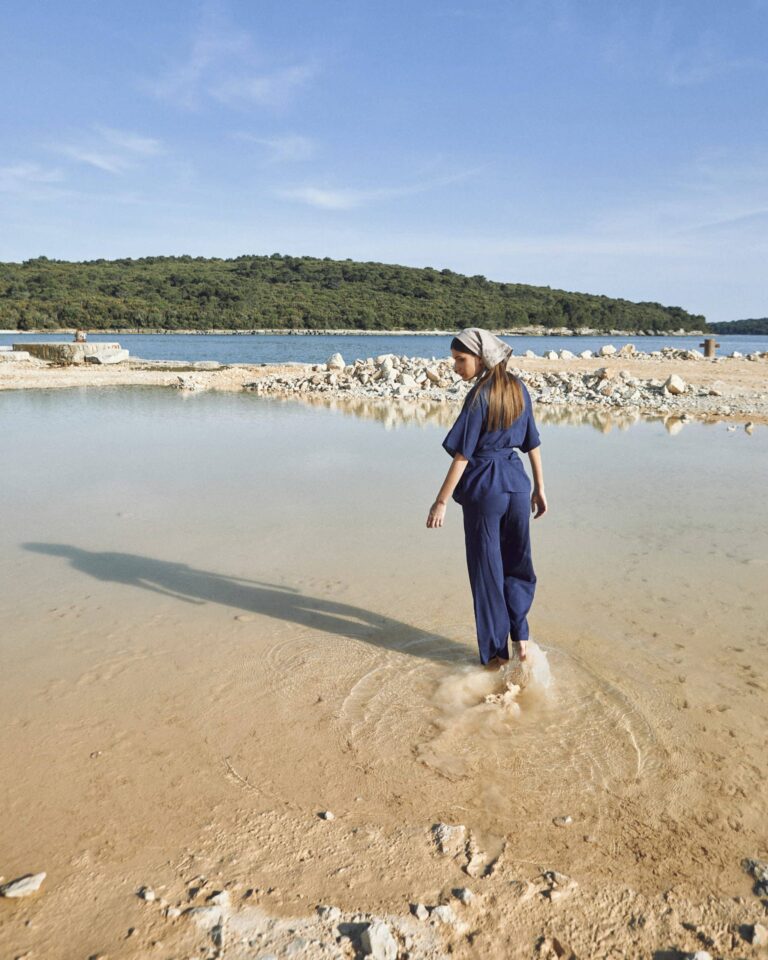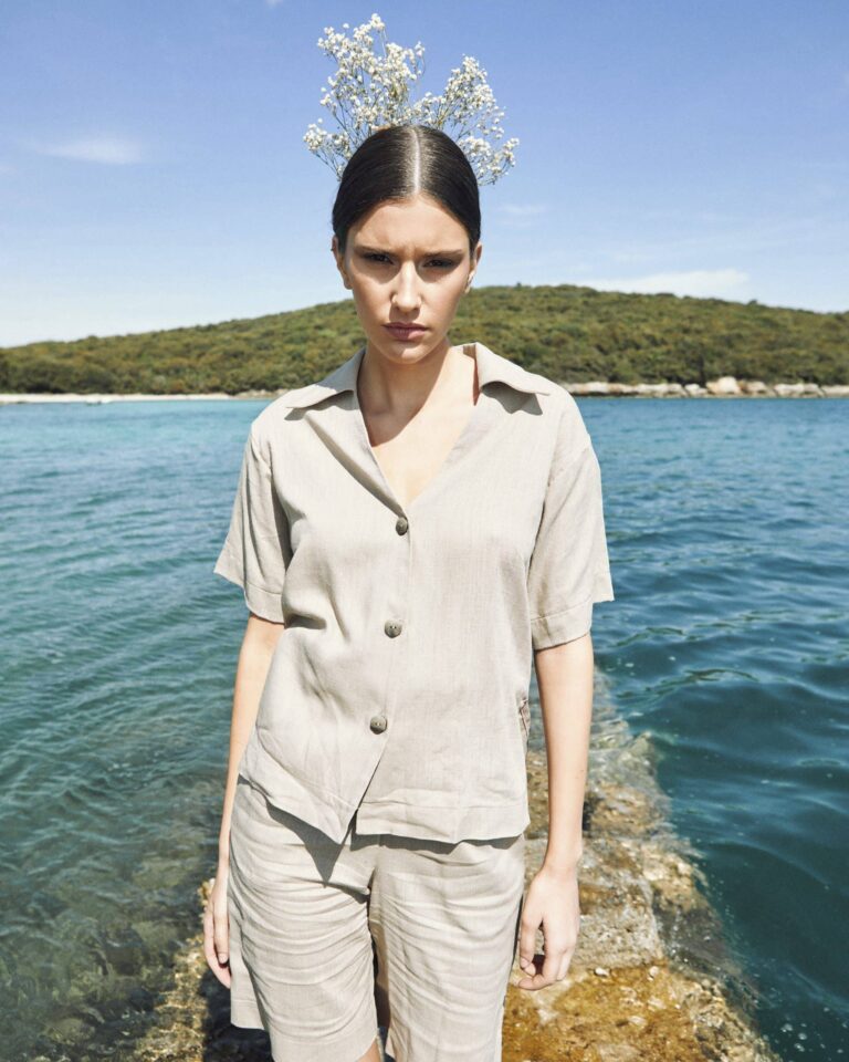 To fully convey the collection’s inspiration, the photo shoot took place at the Štinjan location in Pula Bay. This beautiful landscape, where stone and sea meet, provided the perfect backdrop for presenting clothes that combine tradition and modernity. We wanted to capture the contrast between the hard stone and the softness of the sea, so the collection blended perfectly with the background.