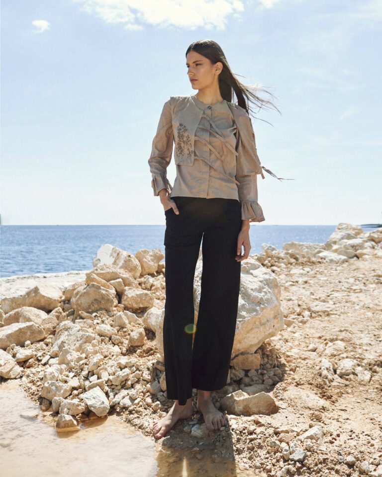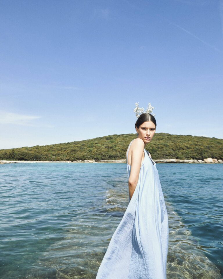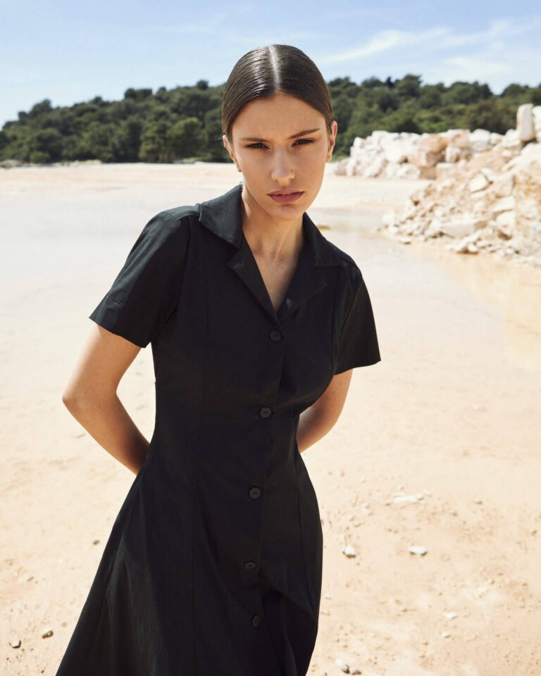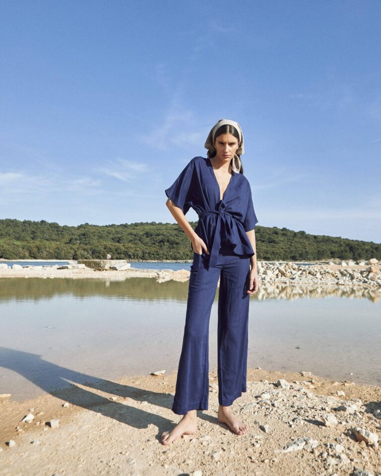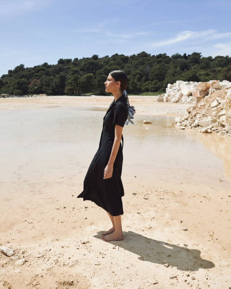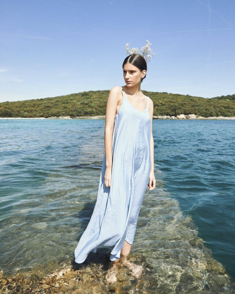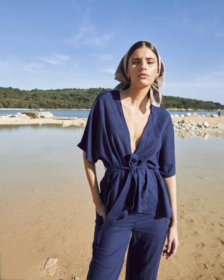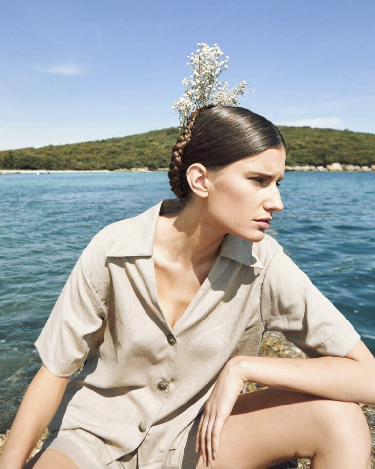 To fully convey the collection’s inspiration, the photo shoot took place at the Štinjan location in Pula Bay. This beautiful landscape, where stone and sea meet, provided the perfect backdrop for presenting clothes that combine tradition and modernity. We wanted to capture the contrast between the hard stone and the softness of the sea, so the collection blended perfectly with the background.