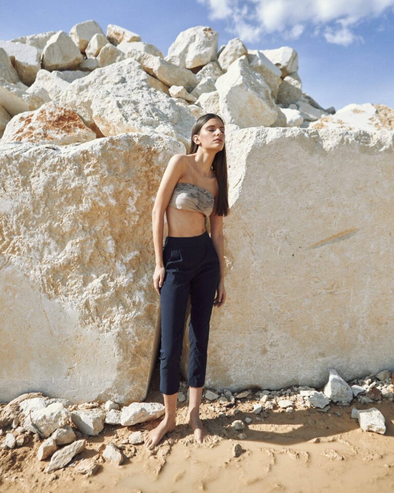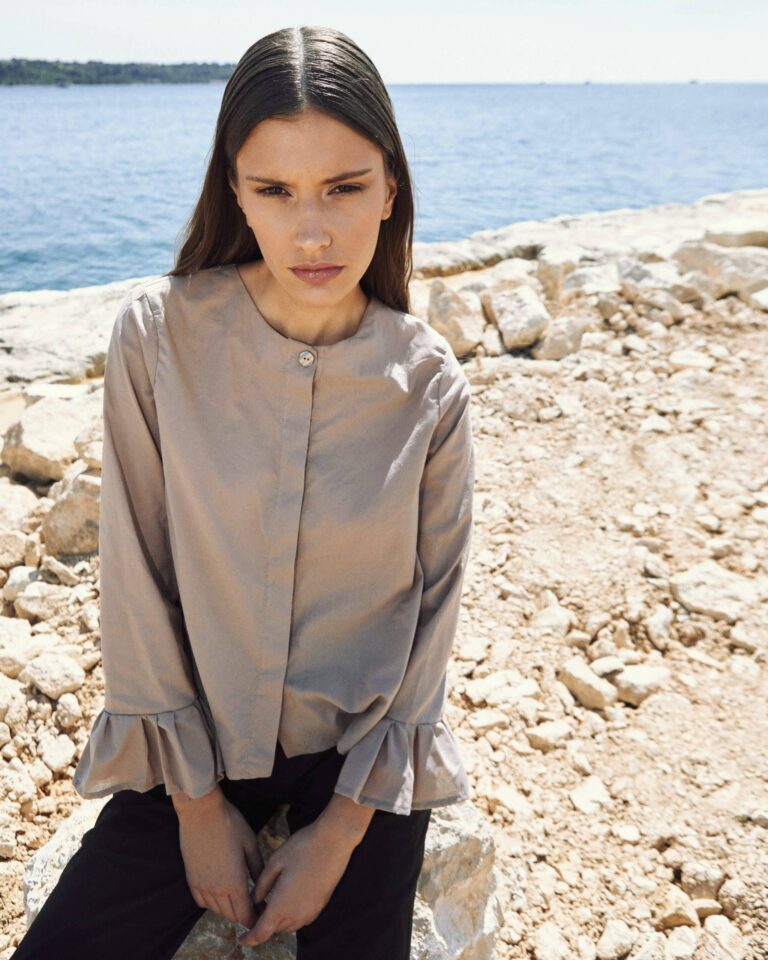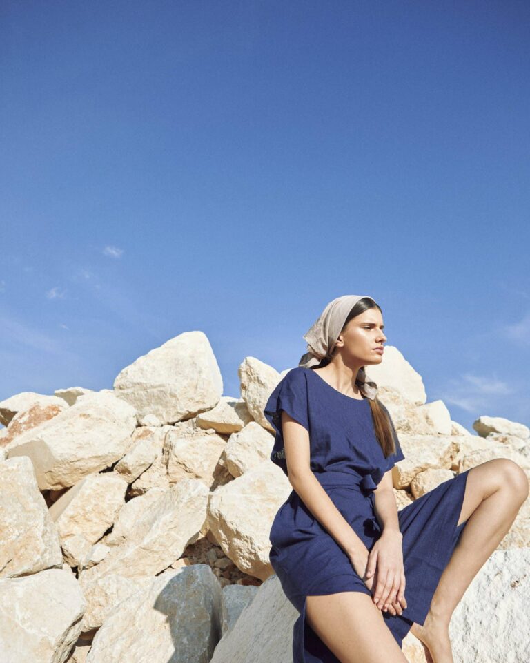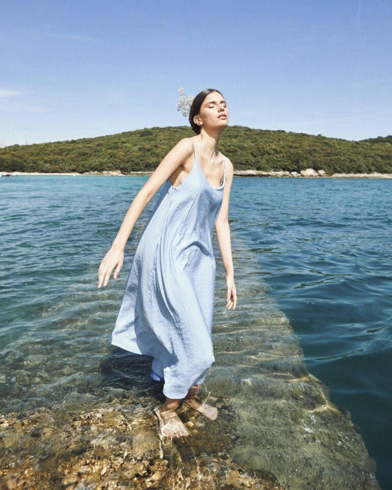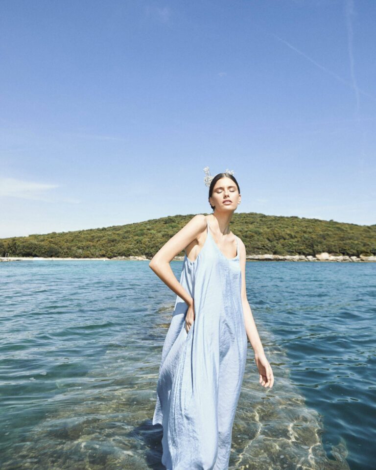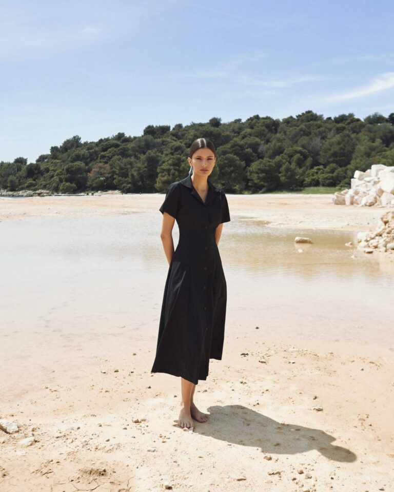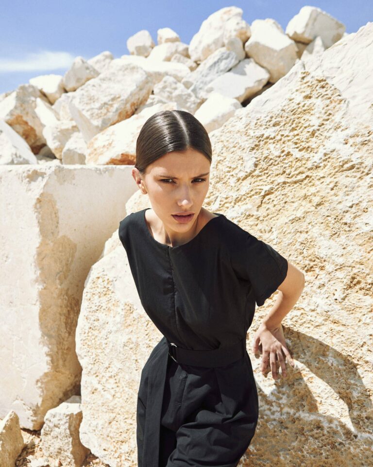 To fully convey the collection’s inspiration, the photo shoot took place at the Štinjan location in Pula Bay. This beautiful landscape, where stone and sea meet, provided the perfect backdrop for presenting clothes that combine tradition and modernity. We wanted to capture the contrast between the hard stone and the softness of the sea, so the collection blended perfectly with the background.