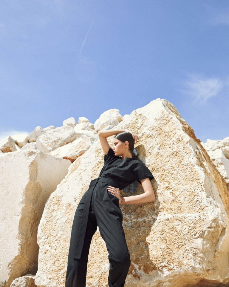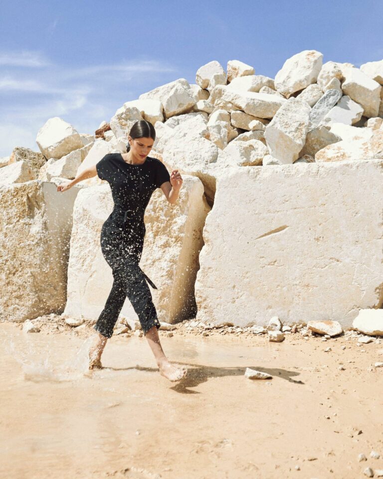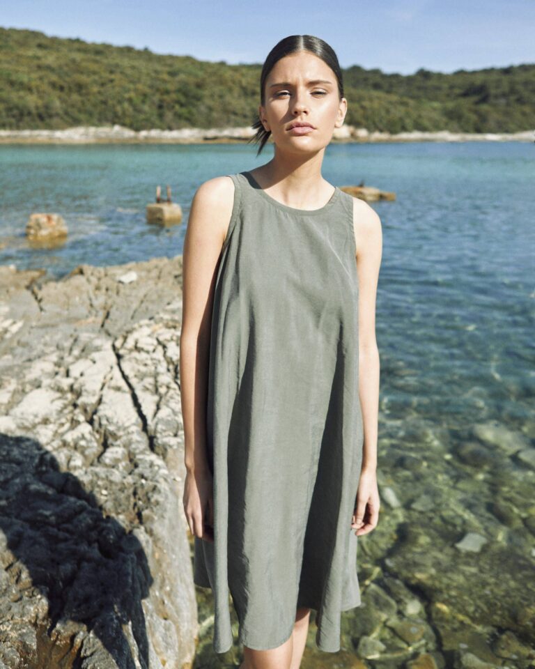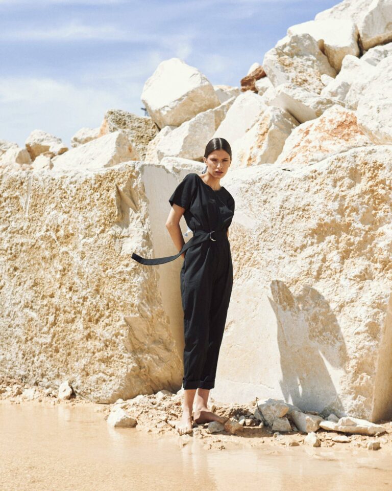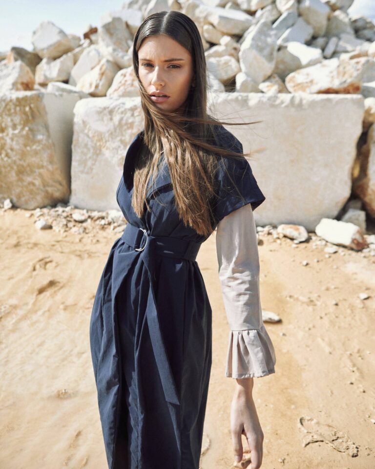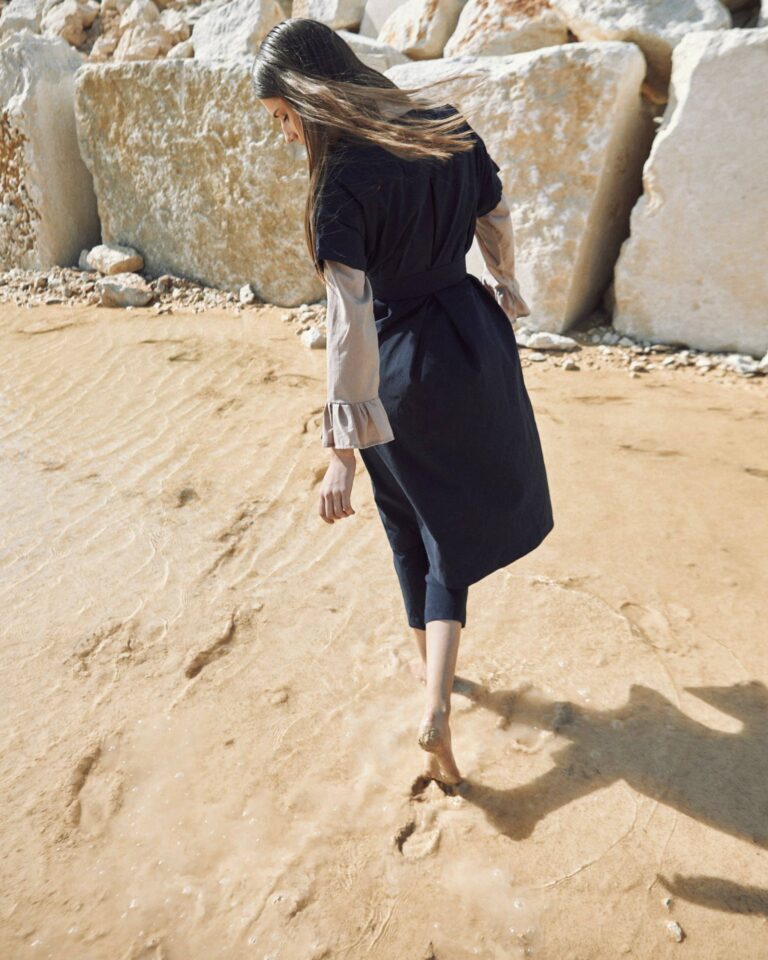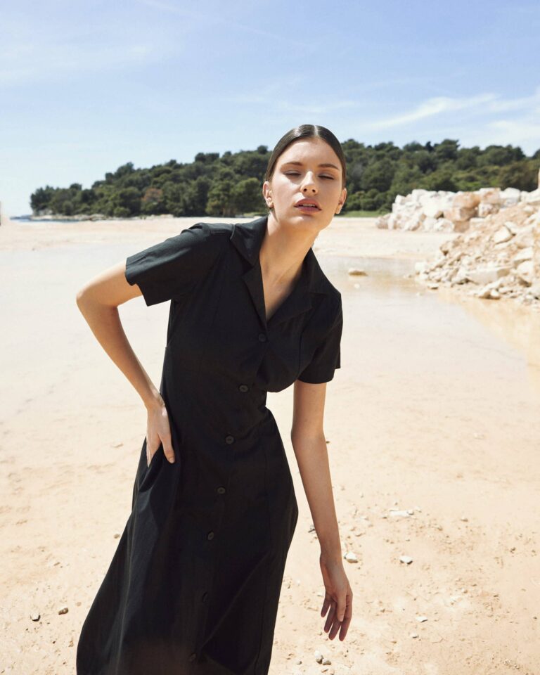 To fully convey the collection’s inspiration, the photo shoot took place at the Štinjan location in Pula Bay. This beautiful landscape, where stone and sea meet, provided the perfect backdrop for presenting clothes that combine tradition and modernity. We wanted to capture the contrast between the hard stone and the softness of the sea, so the collection blended perfectly with the background.