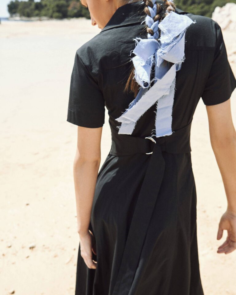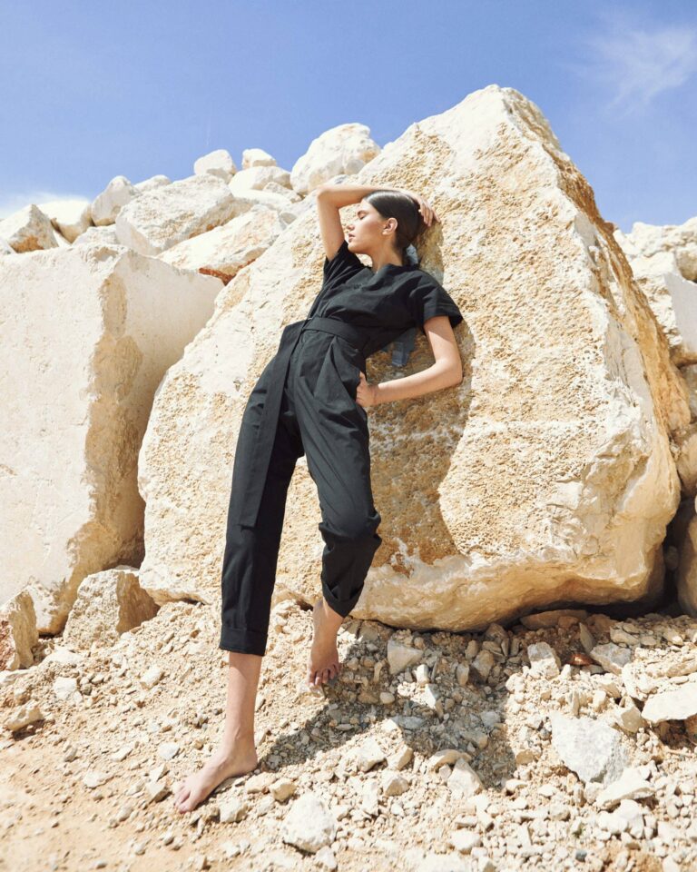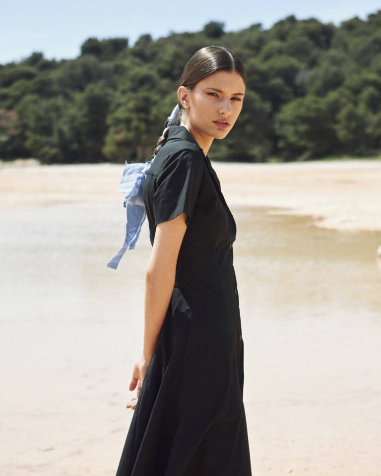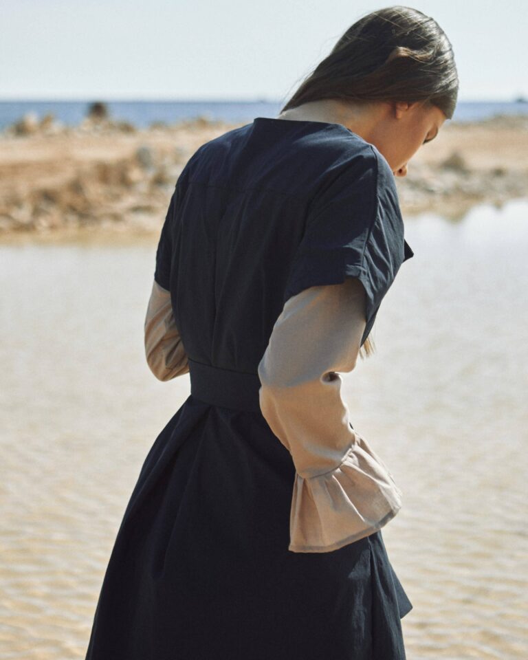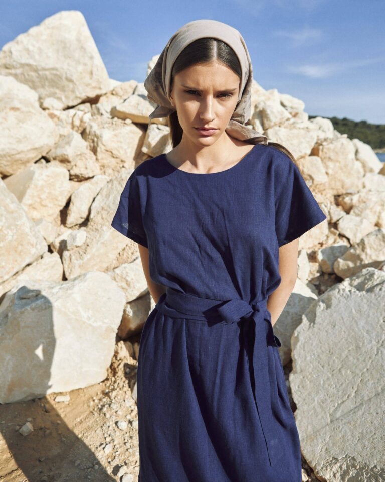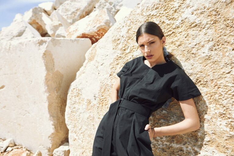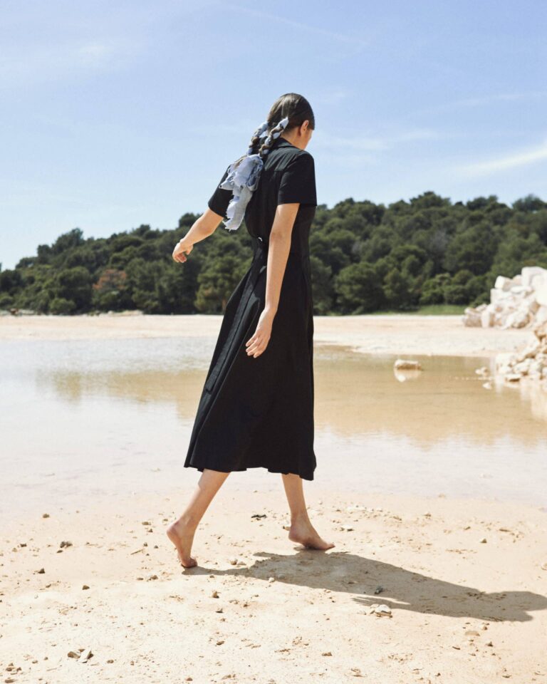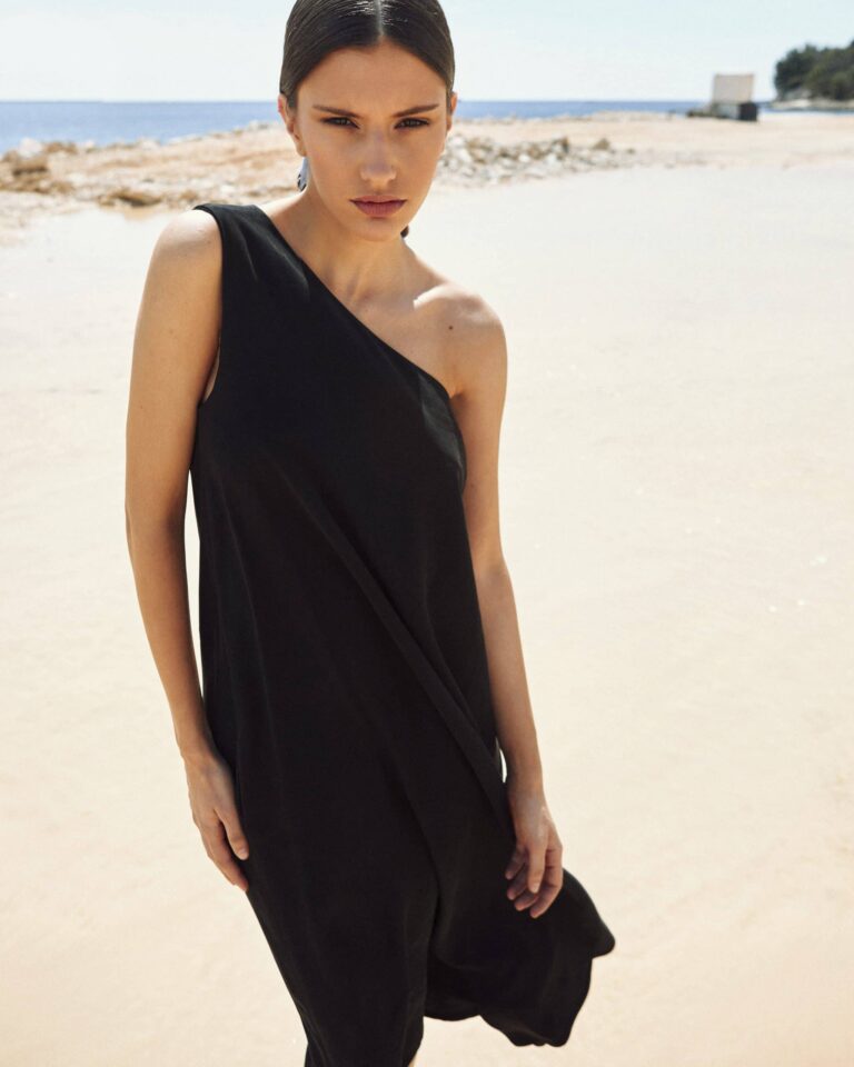 To fully convey the collection’s inspiration, the photo shoot took place at the Štinjan location in Pula Bay. This beautiful landscape, where stone and sea meet, provided the perfect backdrop for presenting clothes that combine tradition and modernity. We wanted to capture the contrast between the hard stone and the softness of the sea, so the collection blended perfectly with the background.