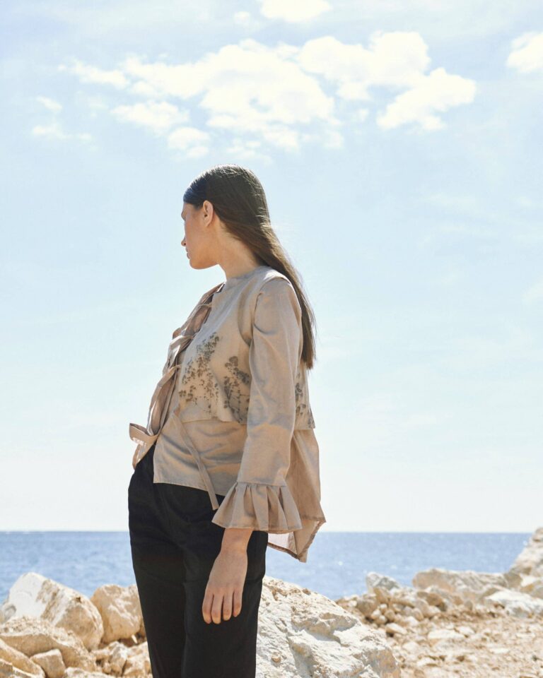 Eco-print is another key element of this collection. Subtle but extremely effective, the eco-print adds depth to every piece. This detail reminds us of our commitment to nature conservation, integrating environmental awareness into the clothing design itself. Each print tells a story and is unique. Silvia Kranjec Gajić, who stands behind the “One with Nature” brand, is responsible for the creation of the eco-print.