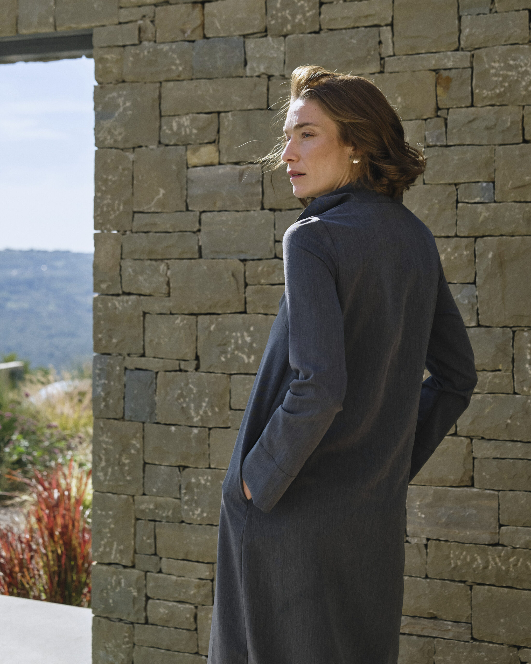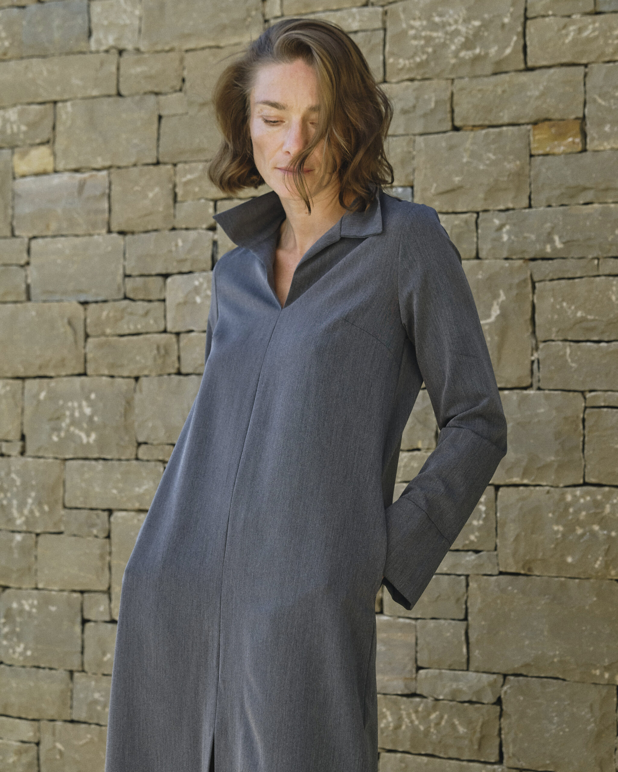 Opis: Moderna siva haljina predimenzioniranog kroja i opuštene siluete, s labavim ovratnikom, prednjim prorezom, otvorenim manžetama i praktičnim bočnim džepovima. Dizajnirana za bezbrižnu eleganciju i udobnost.
