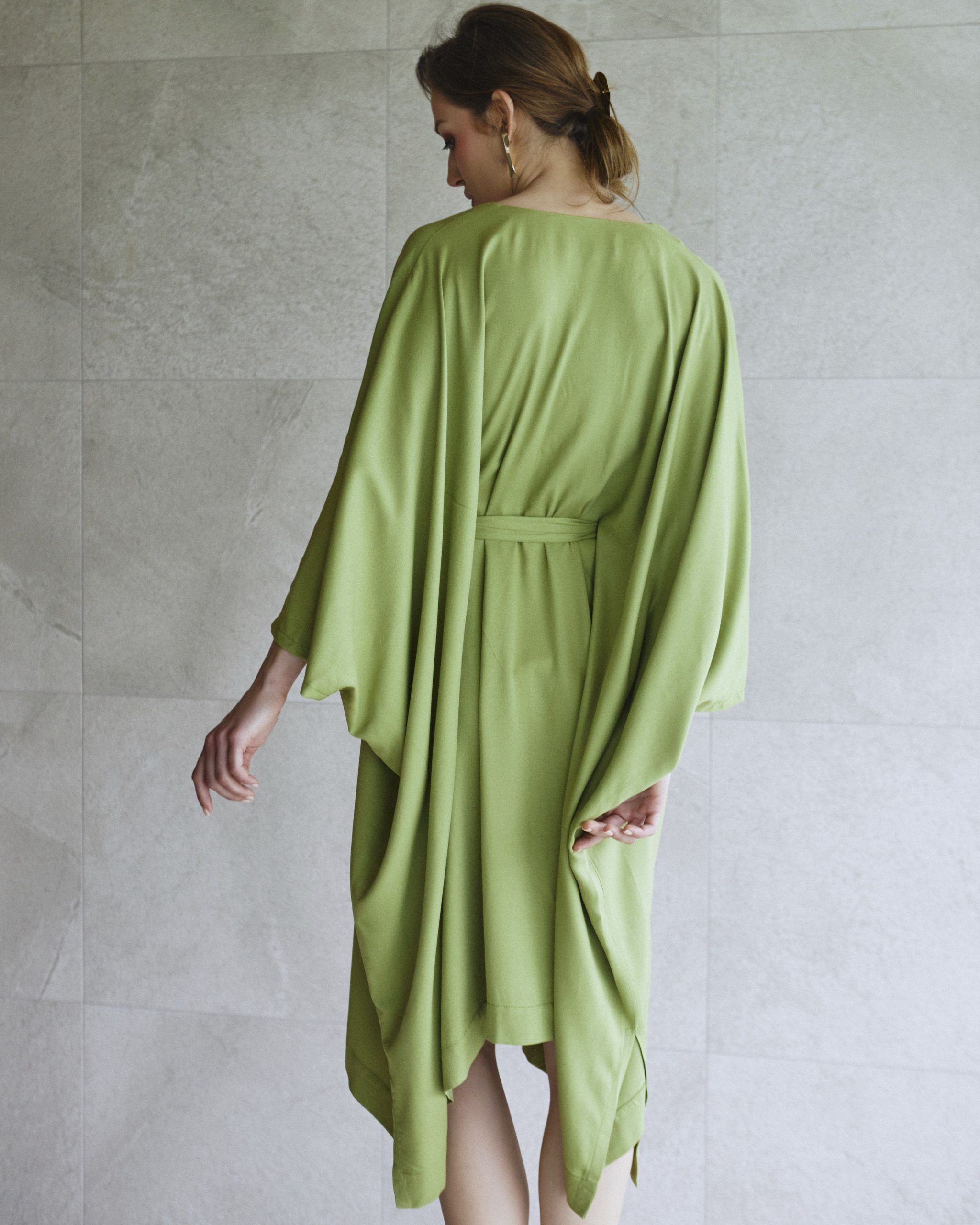 Prekrasno lepršava haljina u stilu kimona dizajnirana za udobnost i eleganciju. Ima laskavi otvoreni V-izrez, rub srednje duljine i bočne proreze za dodatnu pokretljivost. Priloženi remen za struk omogućuje podešavanje oblika, dajući vam mogućnost nošenja labavo ili stegnuto za definiraniju siluetu.