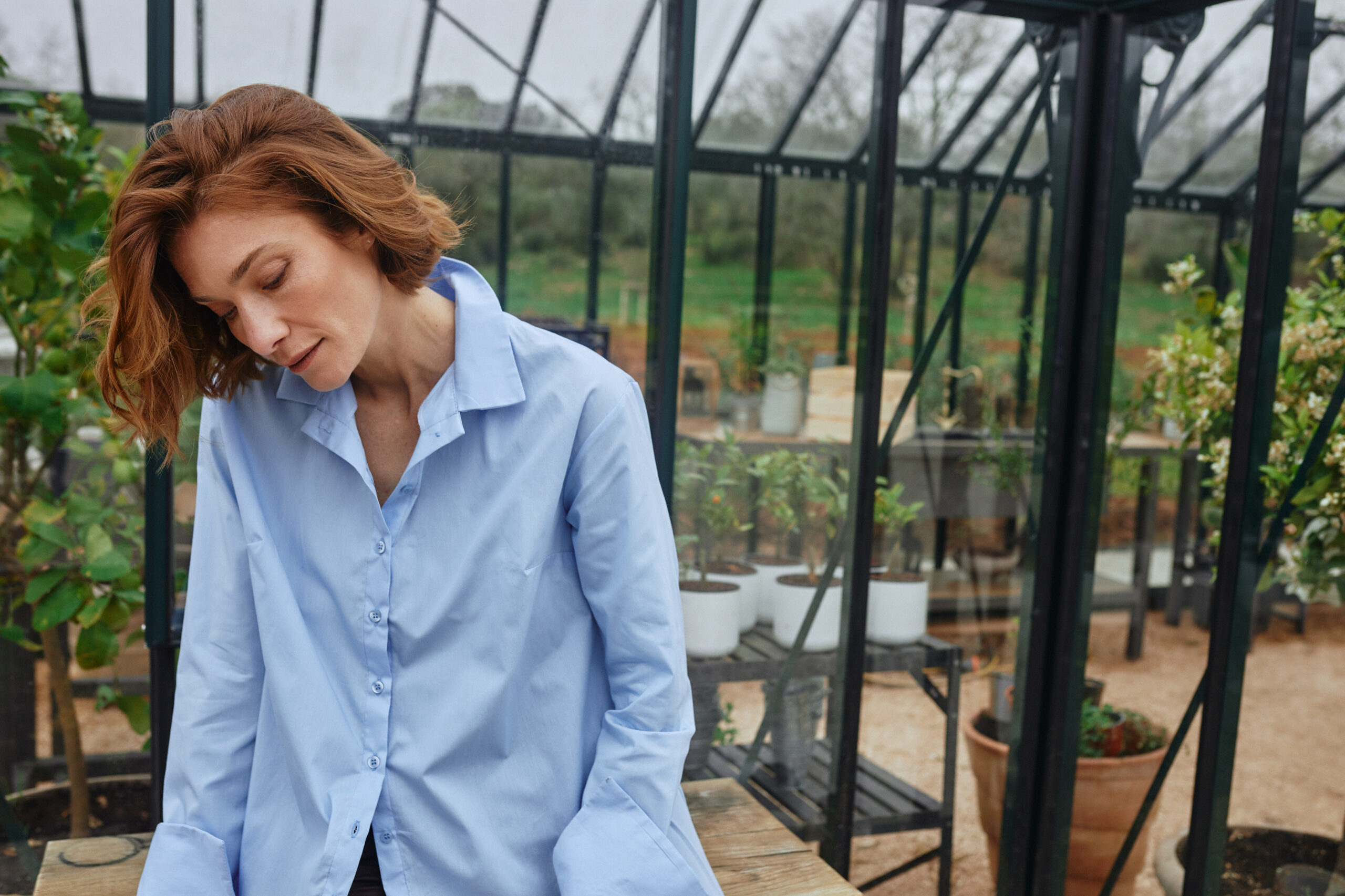 Mekana, prozračna košulja dizajnirana s elegantnim volumenom i lakoćom. S velikodušnim naborima na stražnjoj strani za fluidno kretanje, opuštenim krojem i blago zaobljenim rubom koji je kraći sprijeda. Opušteni ovratnik, kopčanje na gumbe i dramatični prorezi na manžetama upotpunjuju ležeran izgled.