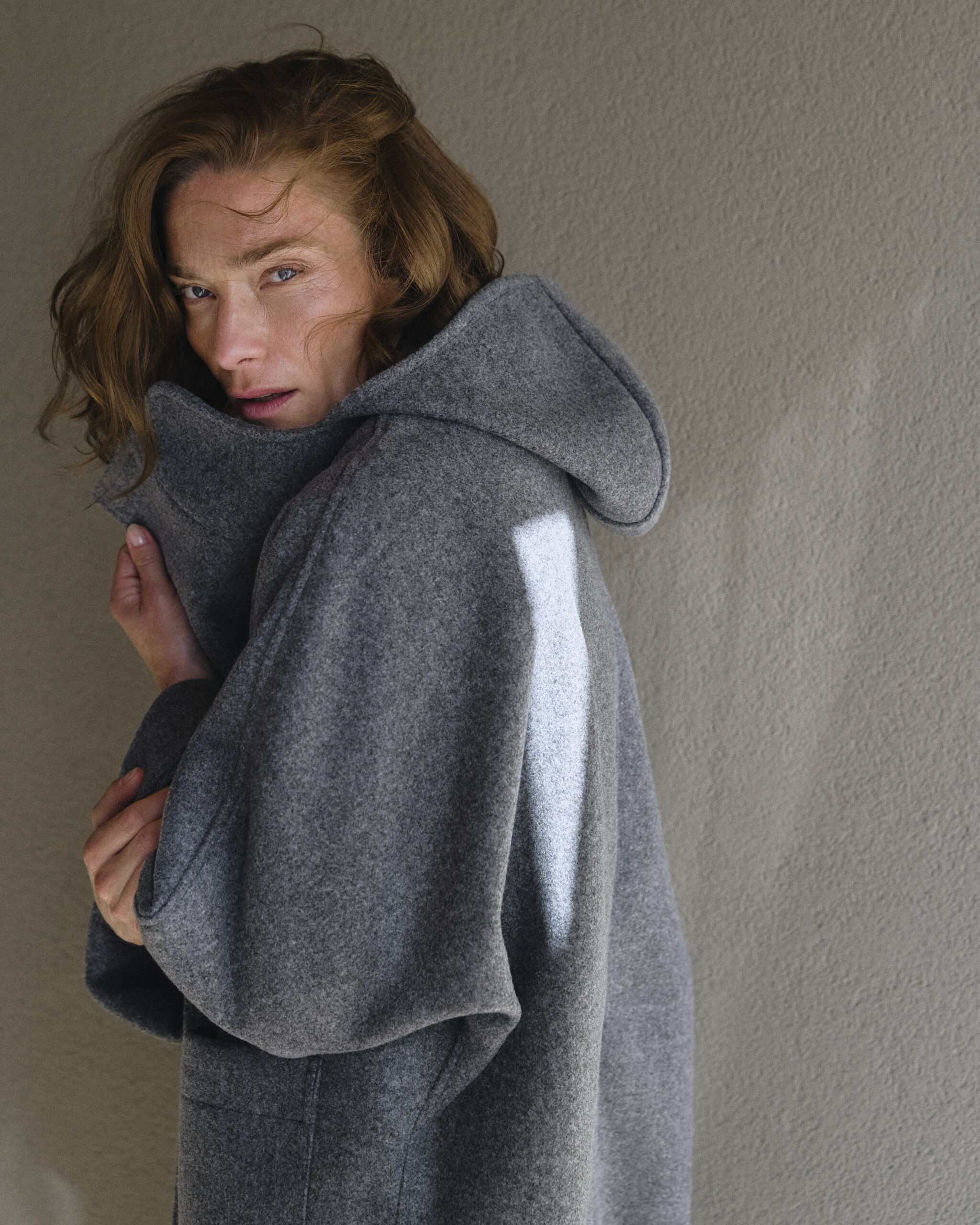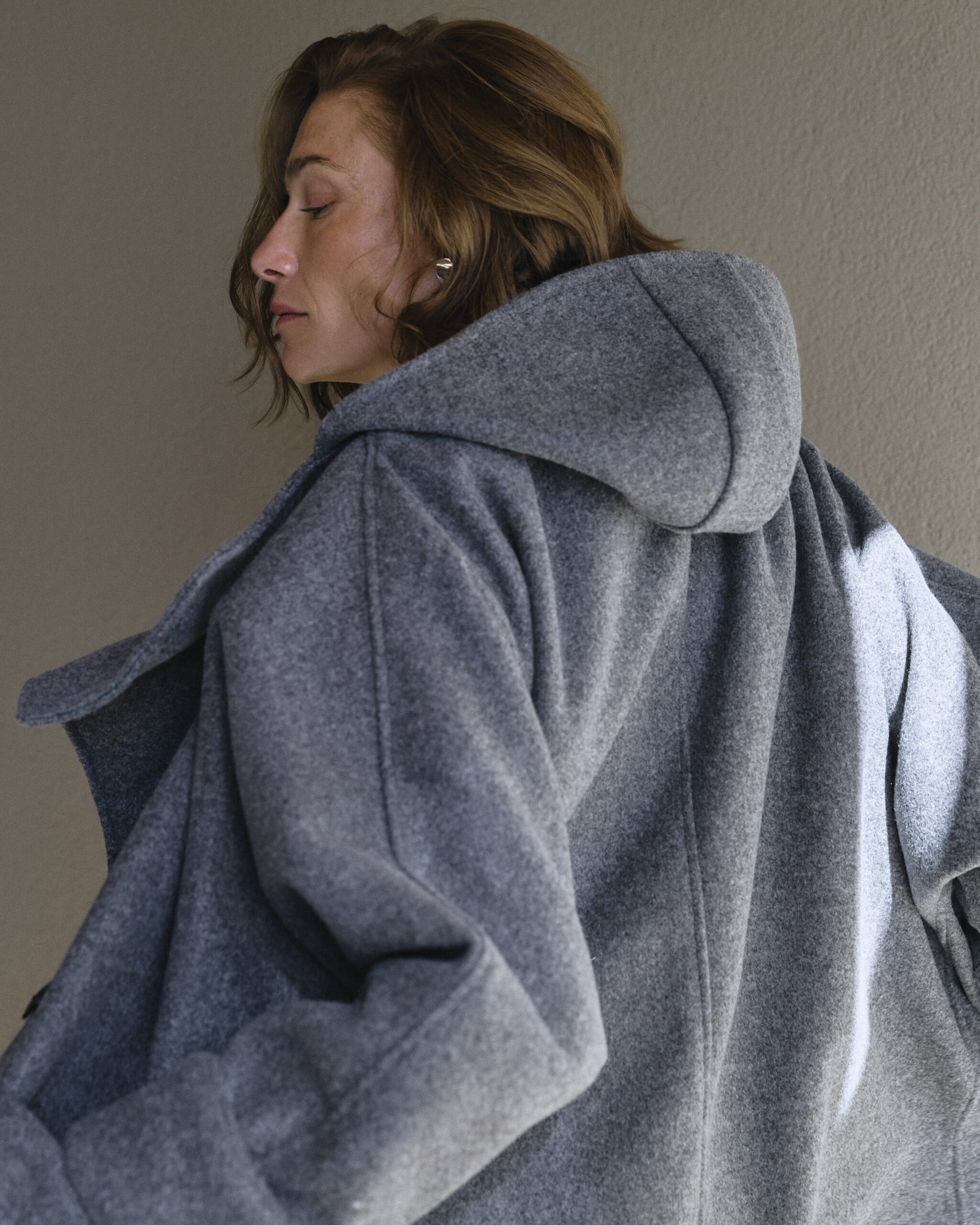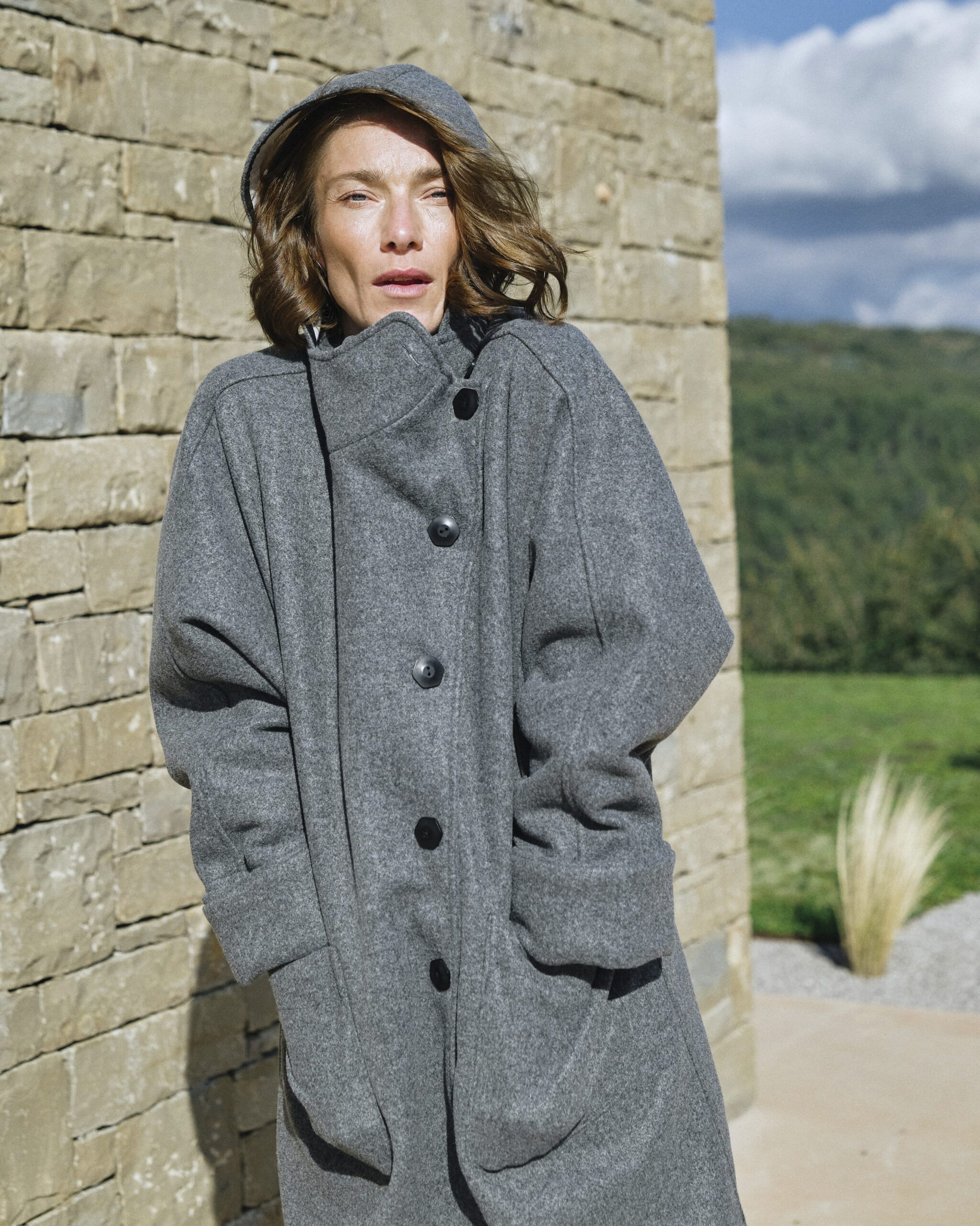 Opis: Prekrasno izrađen kaput od mješavine vune u bezvremenskoj sivoj nijansi, dizajniran s predimenzioniranim krojem i rukavima u stilu kimona. Ima prednje dijagonalno kopčanje na gumbe, preklopljene manžete, prostrane prednje džepove i praktičnu kapuljaču, nudeći udobnost i modernu eleganciju.