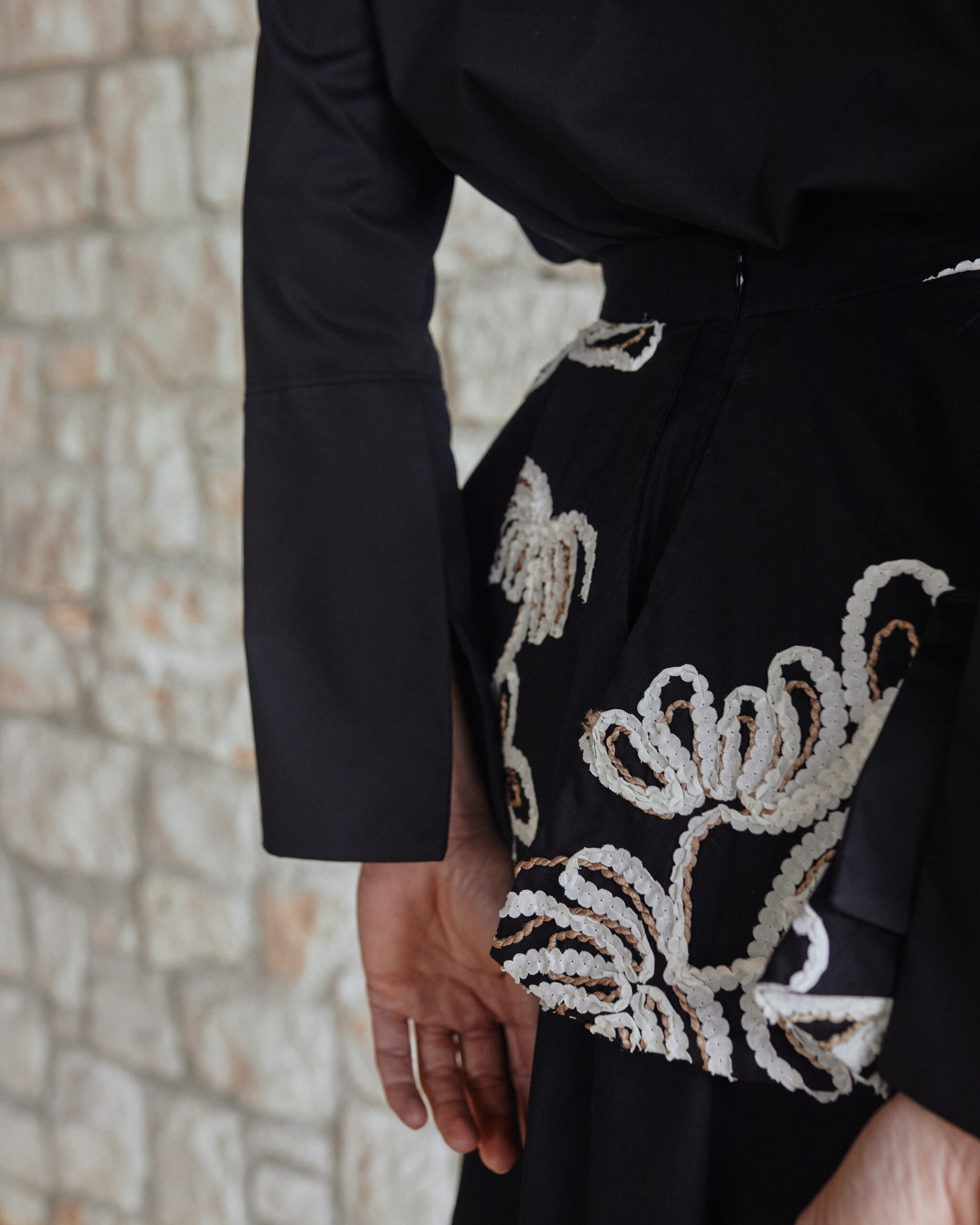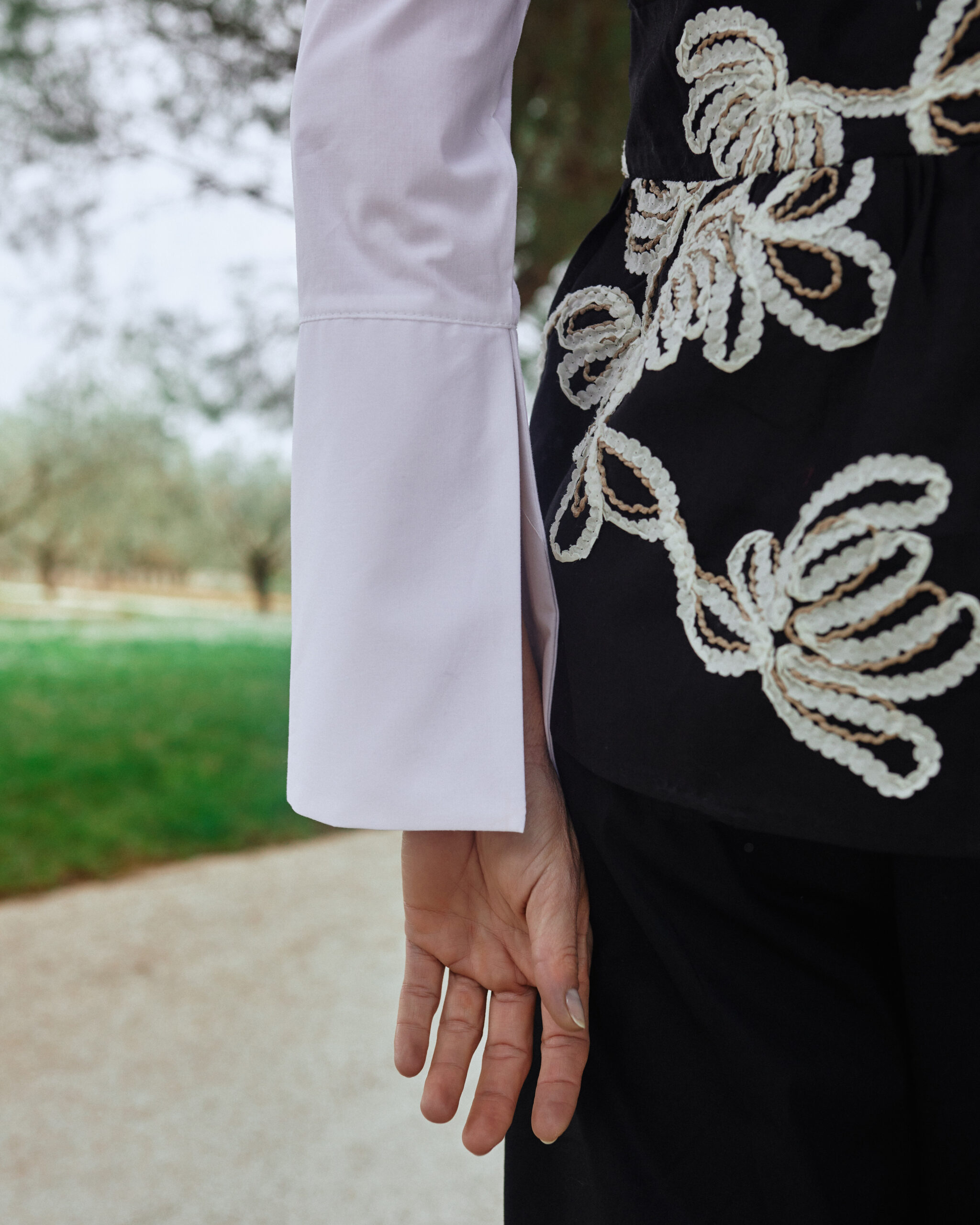 A modern blouse featuring a subtle open V-slit at the front and a structured collar. Designed with fitted shoulders and front darts for a flattering shape, it has a slightly shorter length for a contemporary feel. The sleeves are finished with statement cuffs and open slits, adding an elegant and distinctive touch.