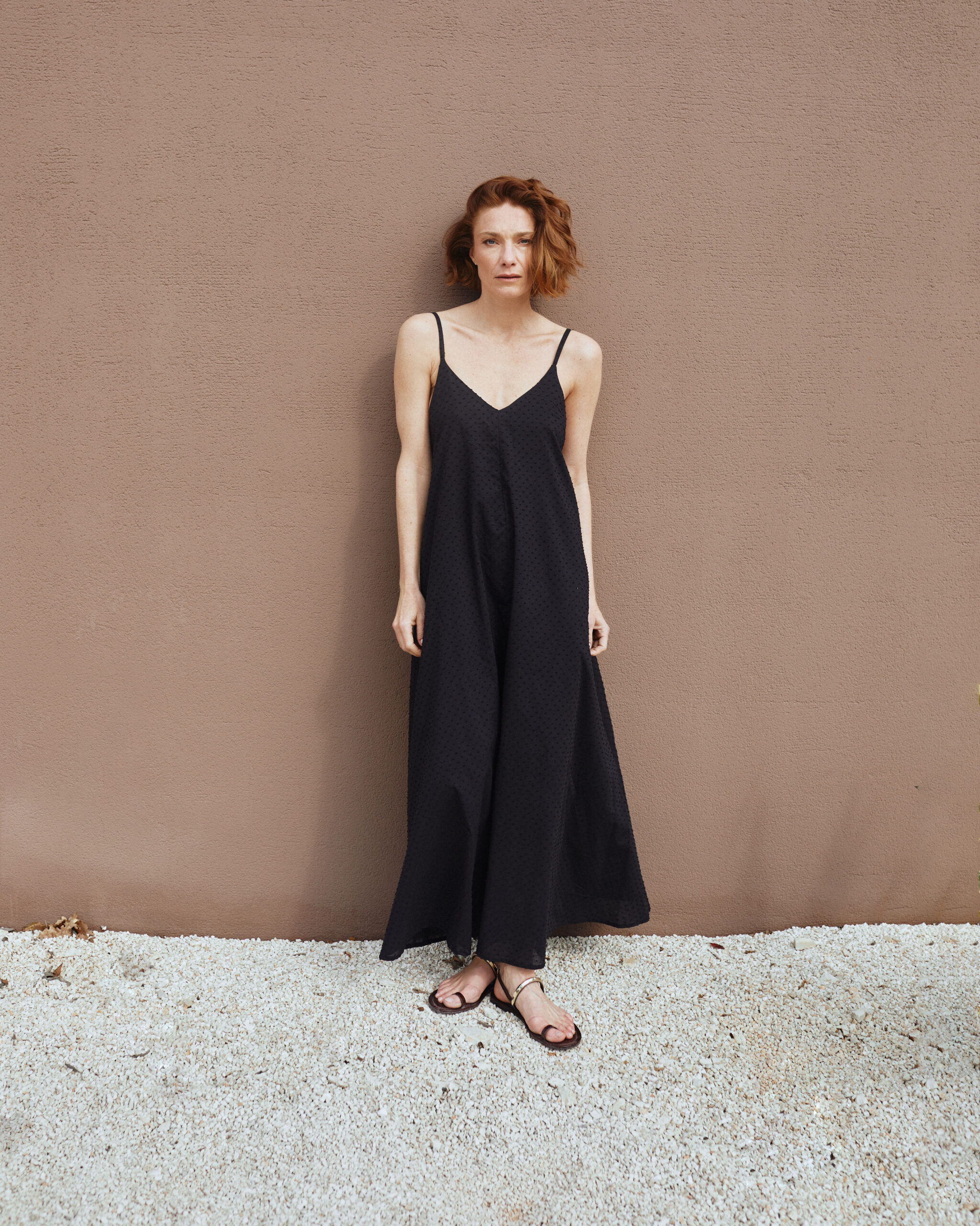 A lightweight and ultra-soft poplin maxi dress crafted from pure cotton, featuring delicate embroidered dots throughout. Designed with a flattering V-neckline and a flowing A-line silhouette, it drapes beautifully for effortless movement. The back is open and softly gathered, creating an elegant, airy feel while adding a subtle statement to the overall look.