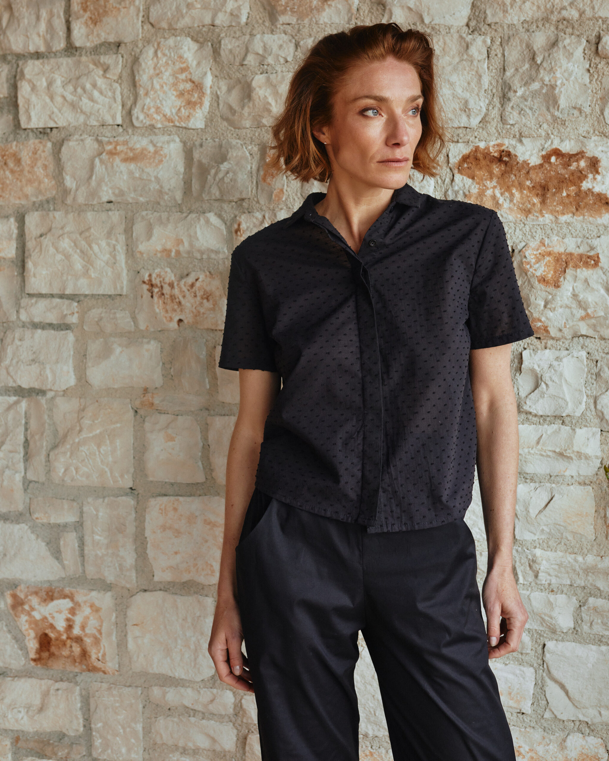 A lightweight and ultra-soft poplin shirt crafted from pure cotton with delicate embroidered dots throughout. Designed with short sleeves and a clean, minimal look, it features a hidden button placket for a refined finish. The back reveals subtle asymmetrical pleats that add movement and a modern silhouette, while the classic collar keeps the piece timeless and versatile.