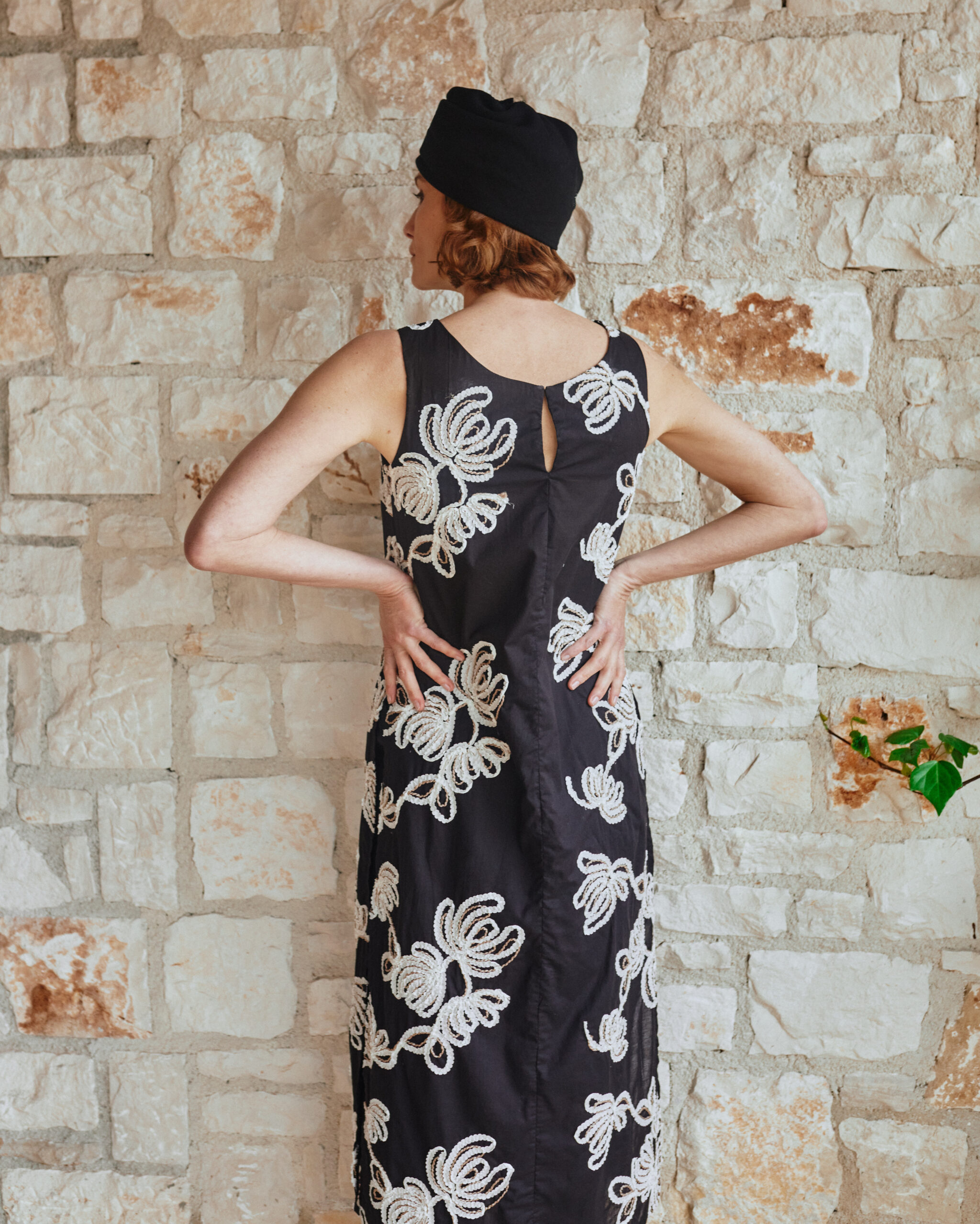 Sleeveless black tunic featuring delicate floral embroidery. Designed with high side slits up to the waist for ease of movement and layering. Made from soft, lightweight cotton poplin, with a subtle back closure for a clean finish.