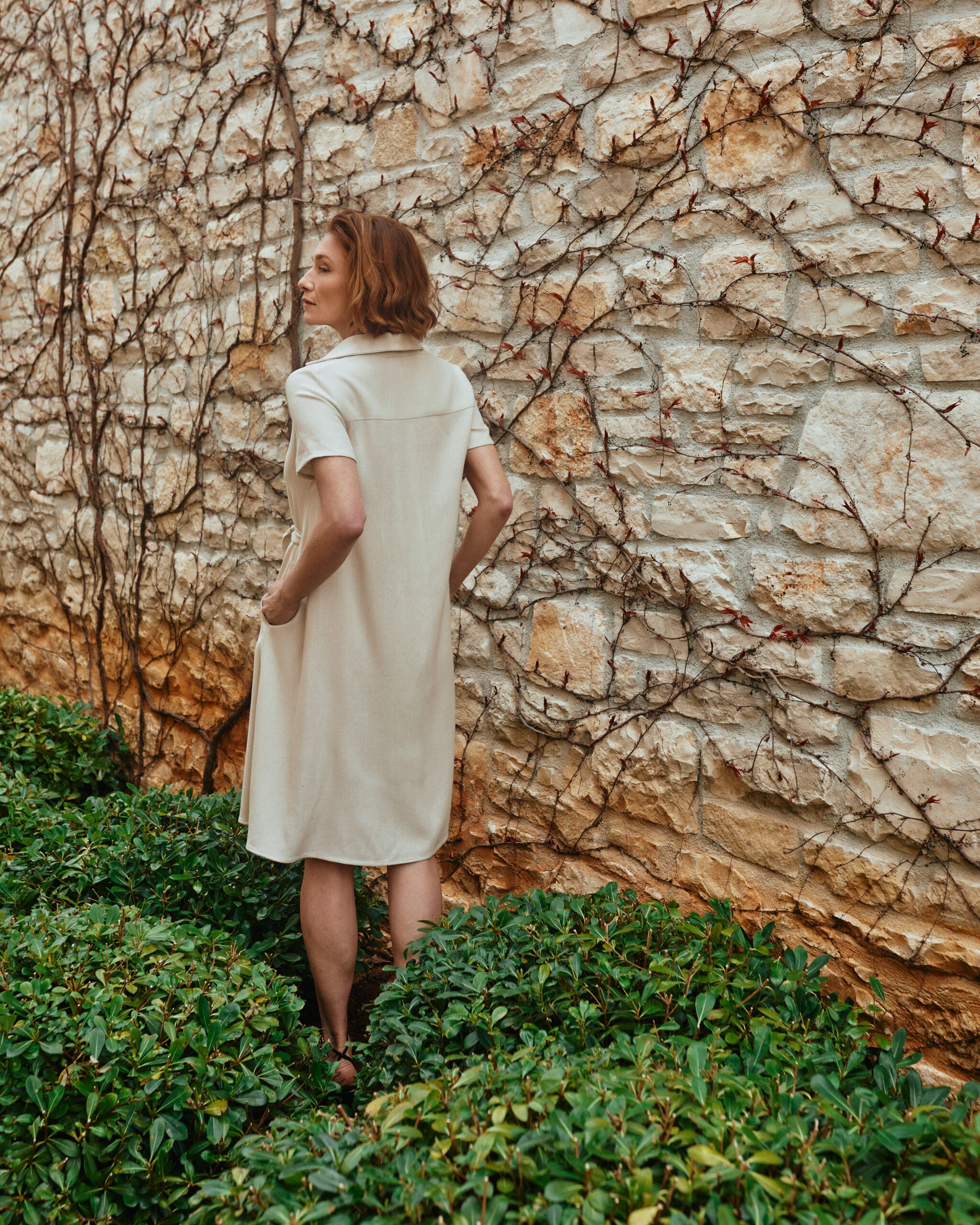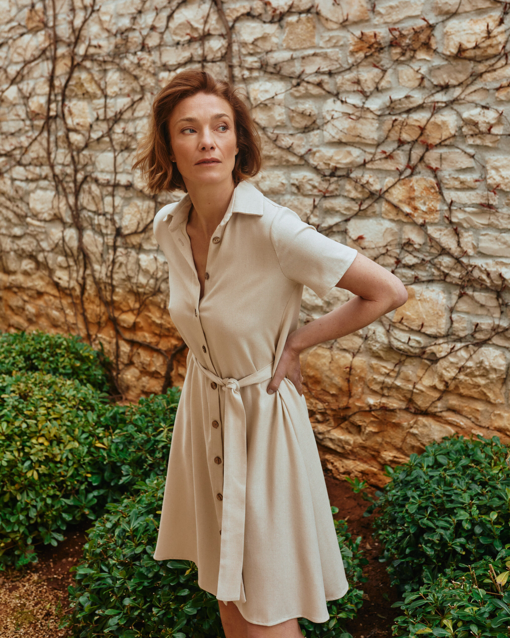 A timeless shirt dress crafted from a super soft and fluid viscose-linen blend, designed for effortless everyday elegance. Featuring a classic collar and full front button closure, this piece combines structure with ease. The waist is softly defined with a matching fabric belt, allowing you to adjust the silhouette to your preference. Gentle gathers at the waist create subtle volume through the skirt, while the fabric drapes beautifully with movement. Short sleeves and discreet side seam pockets add practicality, making it a versatile and comfortable wardrobe staple.