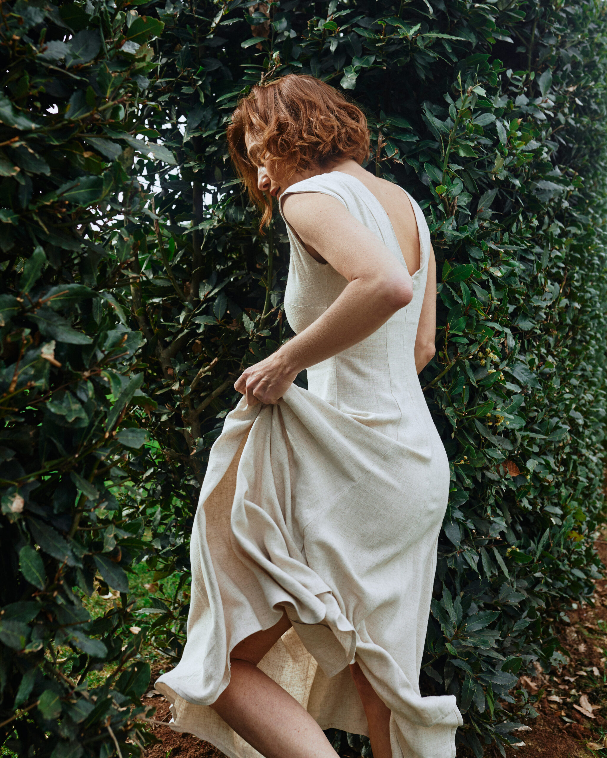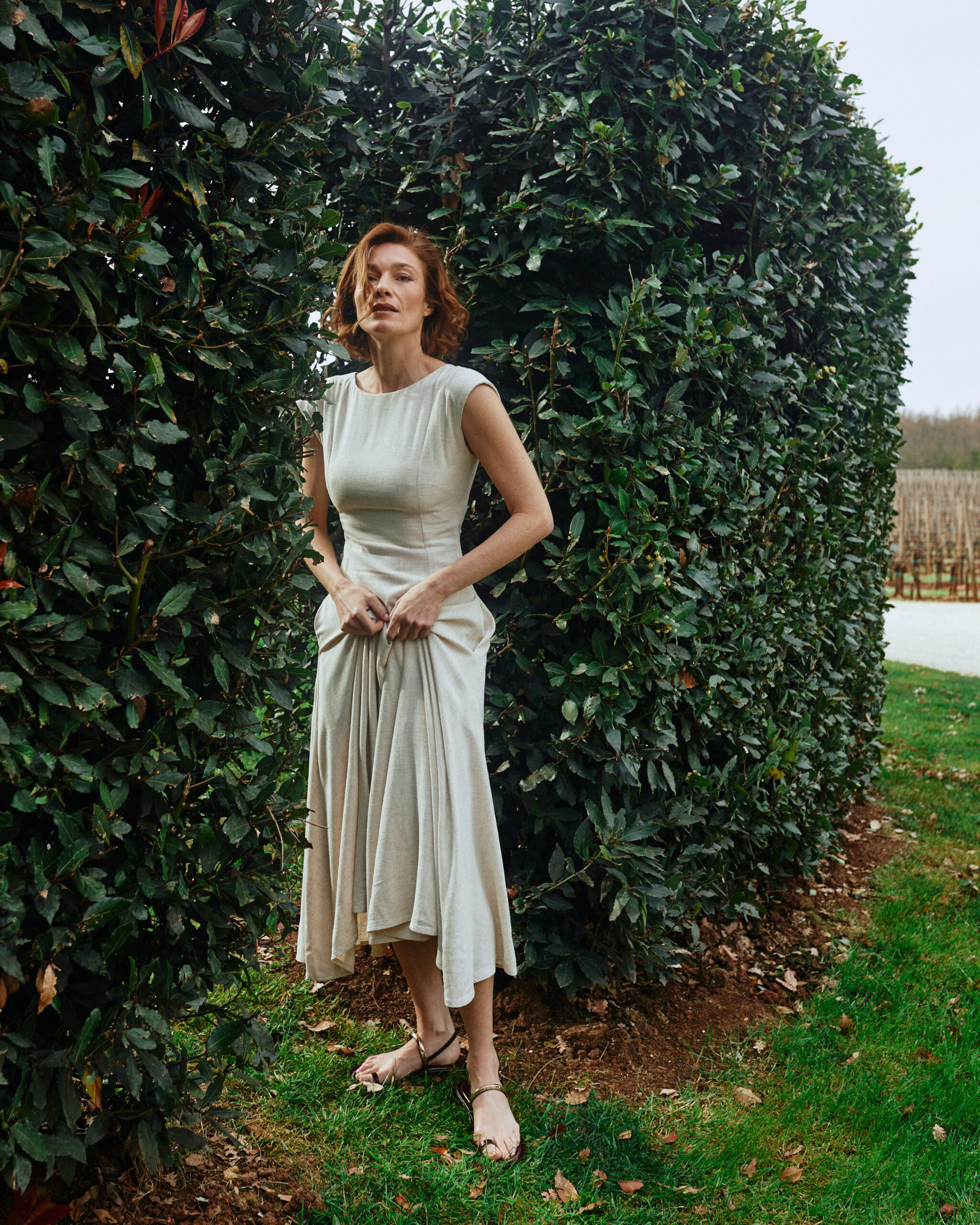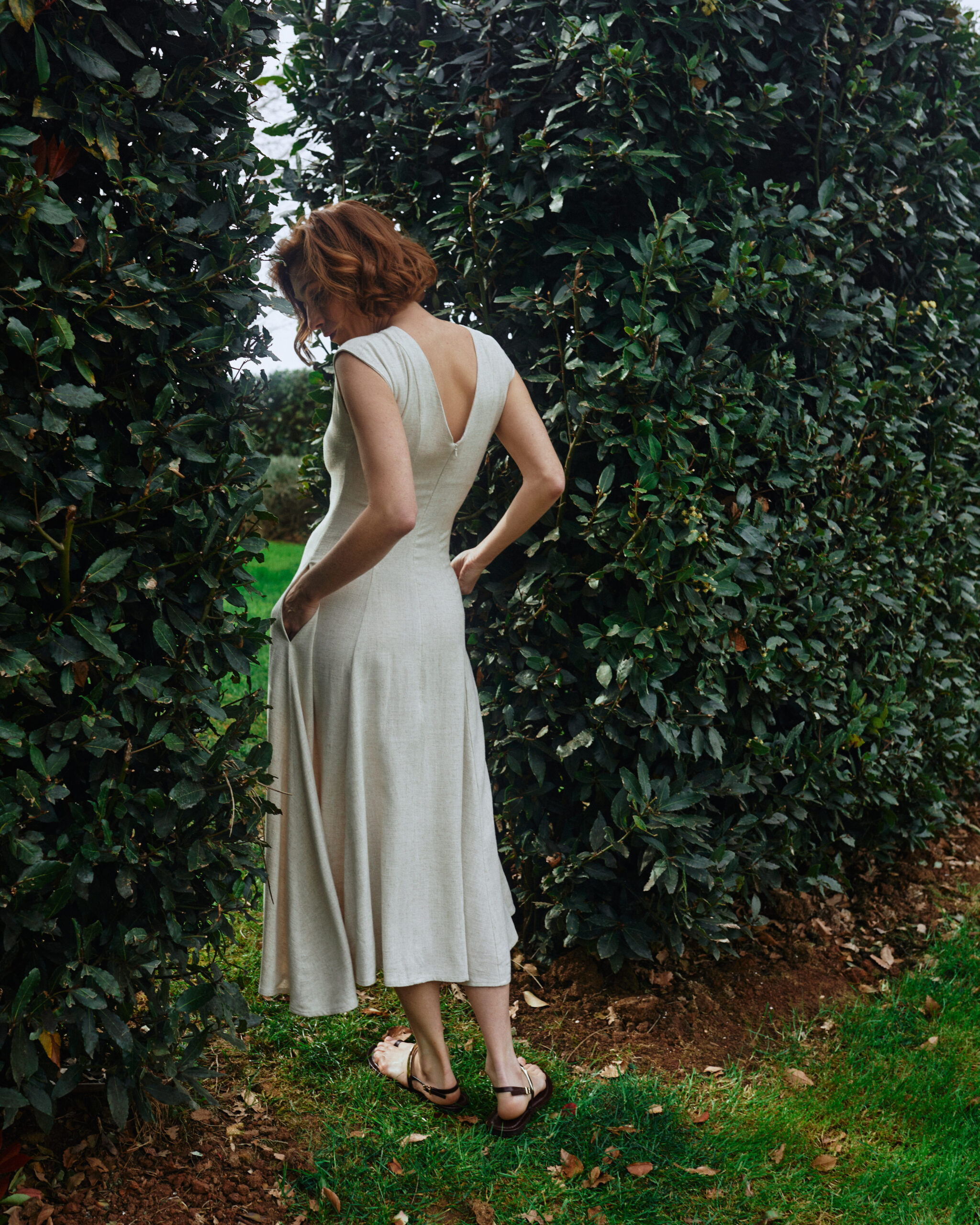 An effortlessly elegant dress designed to move with you from day to evening. Crafted in a soft viscose-linen blend, it features a fitted bodice that flows into a beautifully flared skirt made from generous fabric for a graceful, fluid drape. The open V-shaped back adds a striking touch, while practical side pockets and a concealed zipper complete the design with ease and functionality.