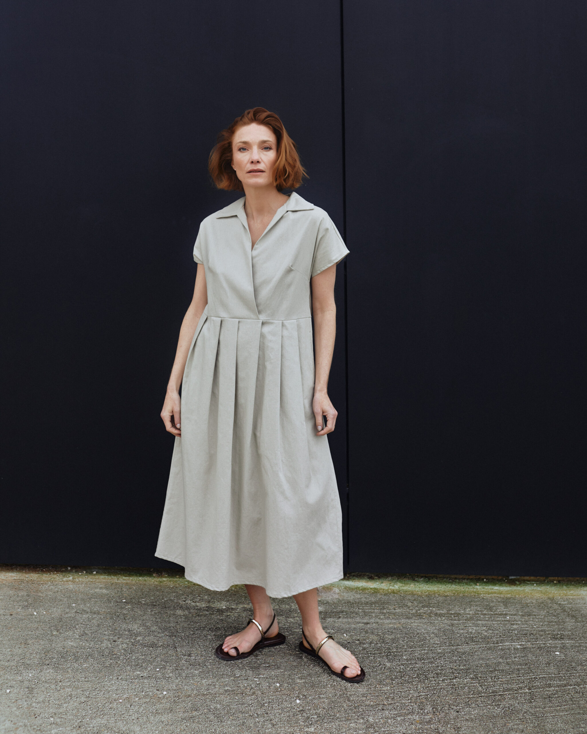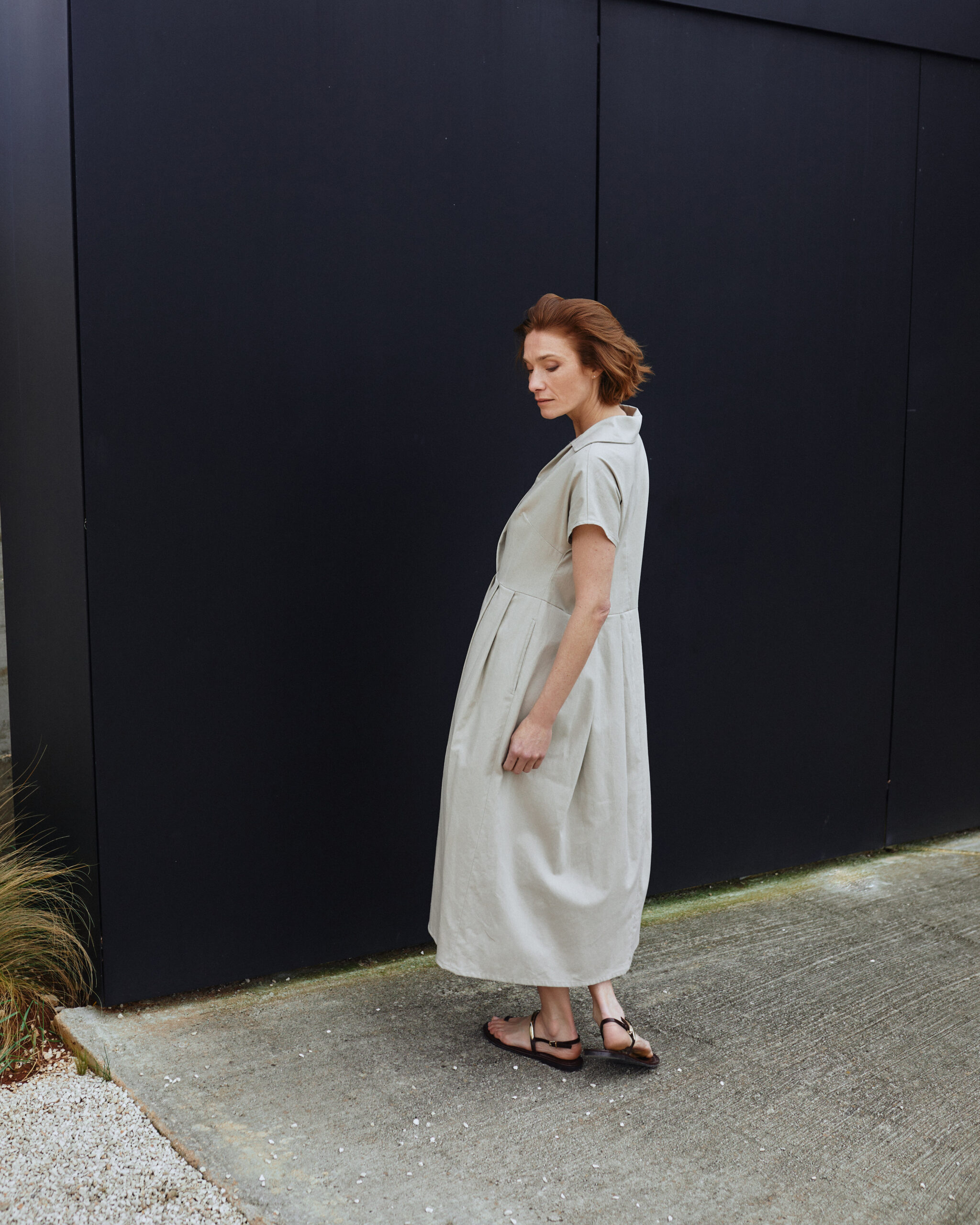 A modern shirt-style dress designed with an effortless oversized silhouette and clean, structured lines. Crafted from a breathable linen-cotton blend, it features a soft collar and a relaxed bodice that flows into a pleated skirt, creating beautiful volume and movement. The pleats add subtle structure while maintaining a light, airy feel. Functional side seam pockets enhance everyday practicality, making this piece as versatile as it is refined. Perfect for both casual wear and elevated styling.