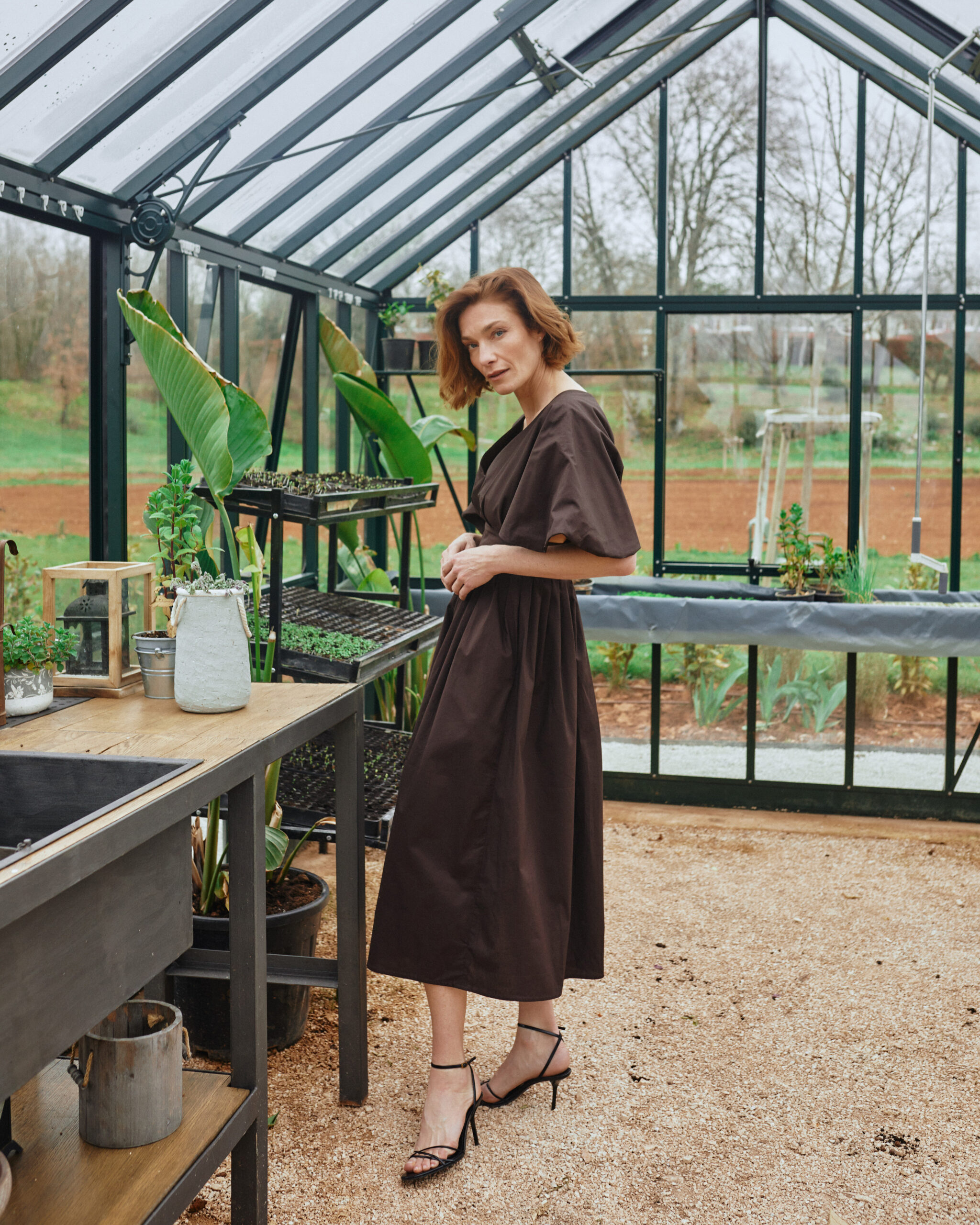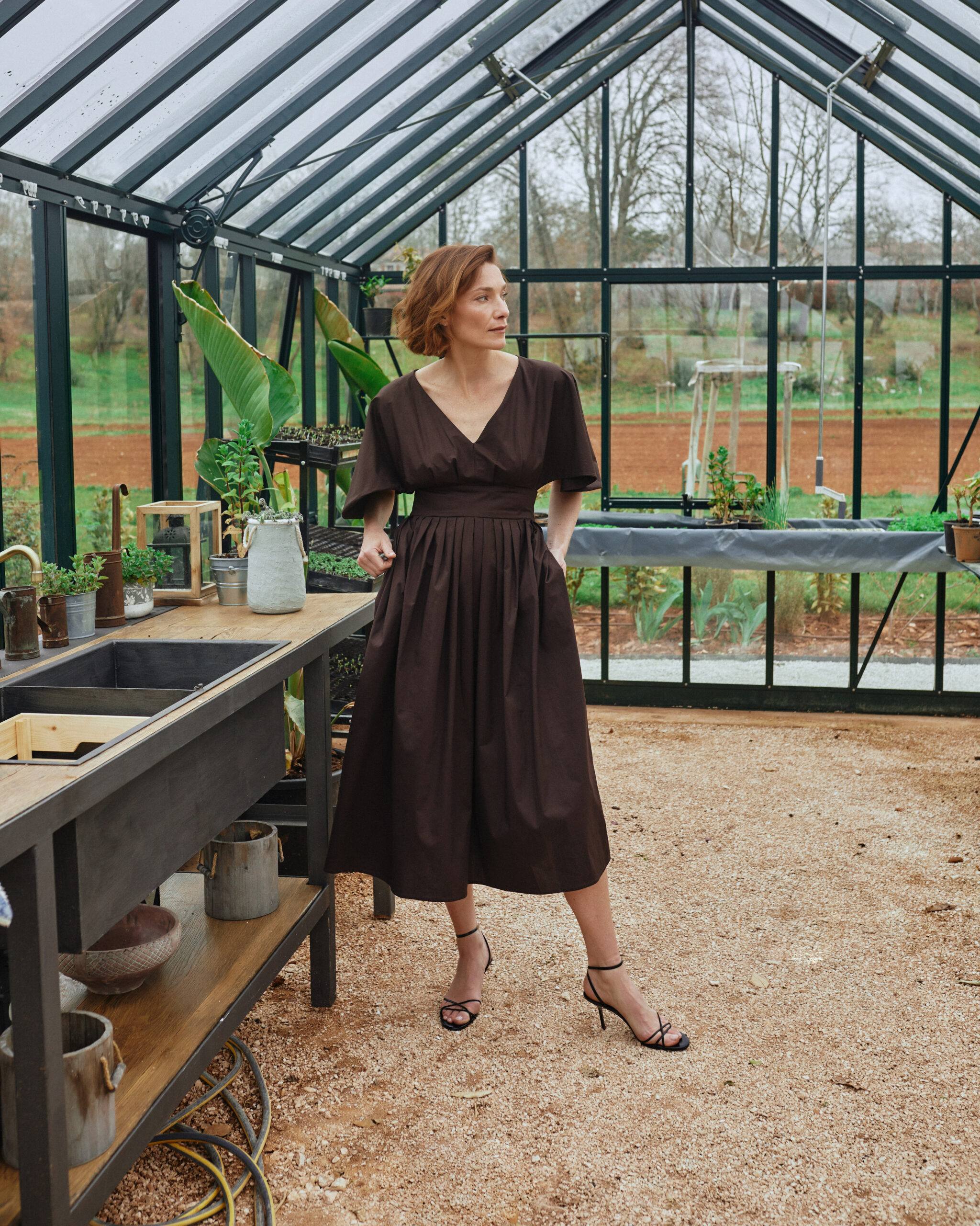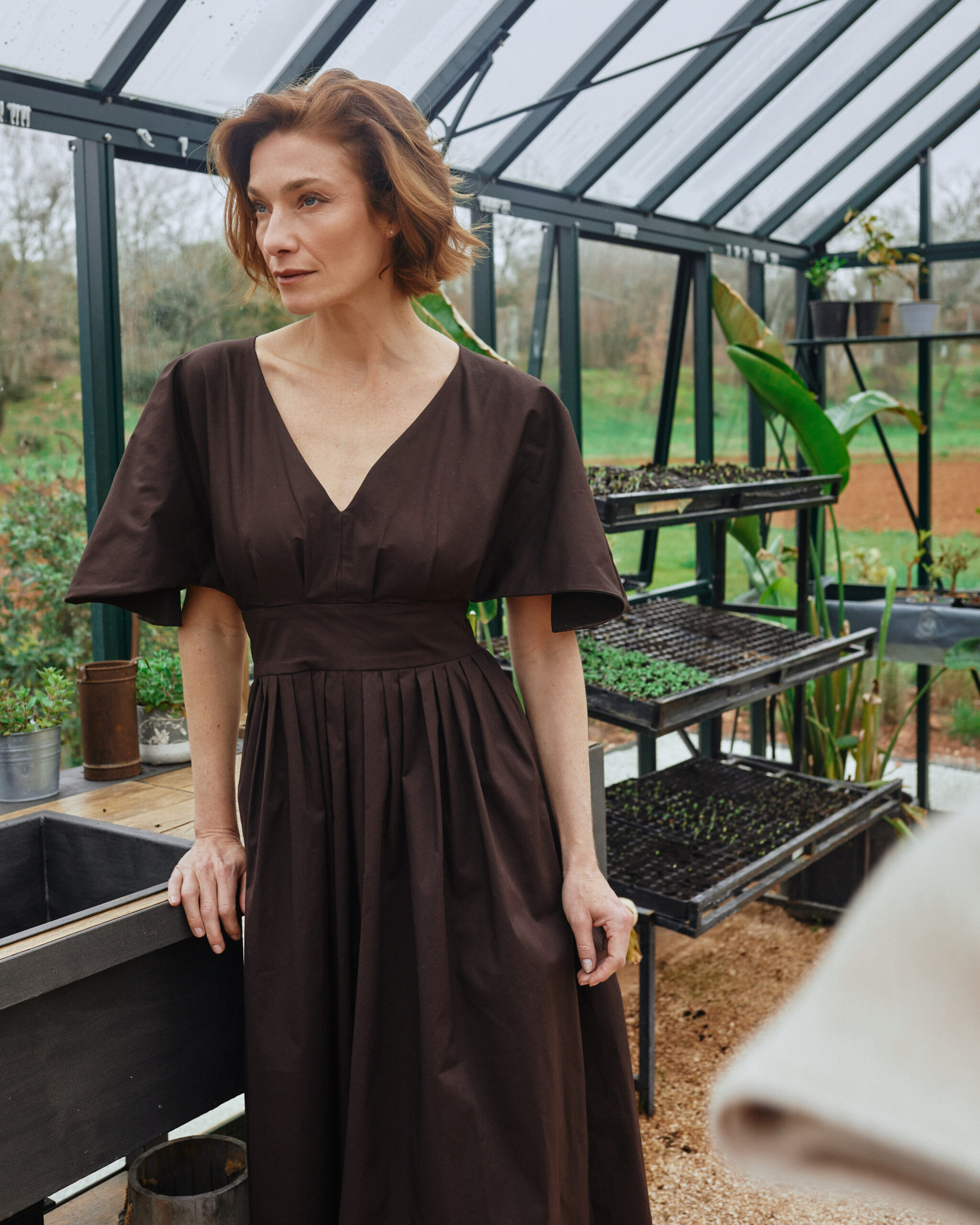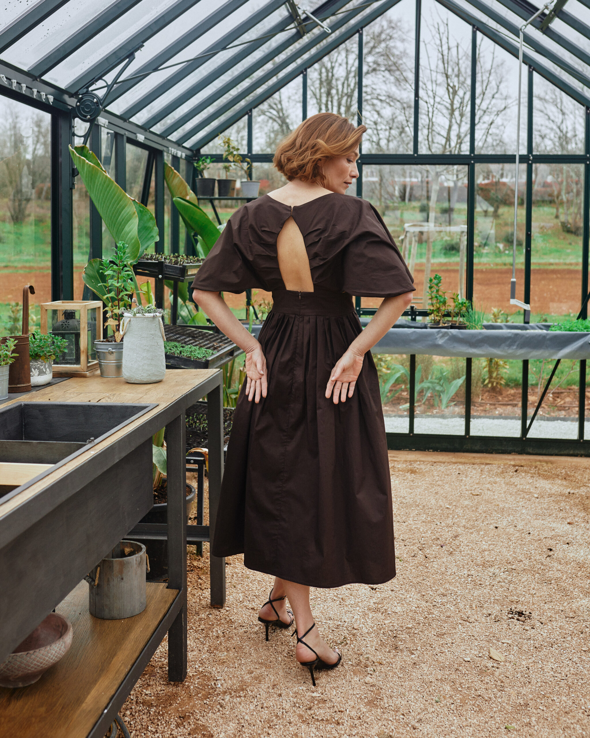 An elegant and structured midi dress crafted from soft, breathable cotton with a touch of stretch for comfort. Designed with a flattering fitted waist and a beautifully pleated skirt that creates lovely volume and movement. The front features a clean V-neckline, while the statement back reveals an open detail framed by soft gathering. The top part is lined in the same fabric for a refined finish. Practical side seam pockets add ease, while a hidden zip at the back ensures a clean silhouette. The dress is secured at the upper back with two delicate hook-and-eye closures. Wide, sculptural sleeves complete the look with a modern, architectural feel.